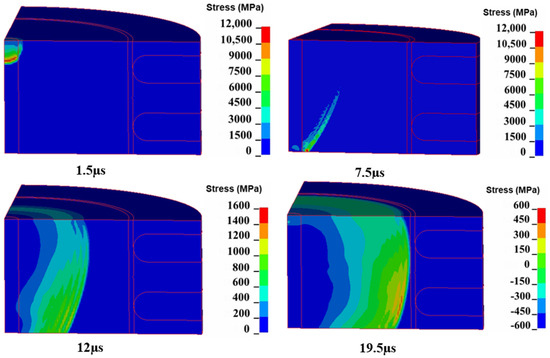 By 7.5 µs, the blast wave reaches the base of the explosive charge, signifying complete detonation. During the 1–7.5 µs interval, the wavefront pressure exceeds 10,000 MPa as the blast wave propagates within the column. By 12 µs, a hemispherical shockwave forms at the current contact interface. As this wave propagates toward the interface wall, its intensity attenuates significantly. By 19.5 µs, upon reaching the current contact wall, the shockwave pressure has diminished to several hundred MPa. Subsequently, the current contact structure undergoes severe elastic-plastic deformation under shock loading, ultimately leading to structural failure through material rupture.