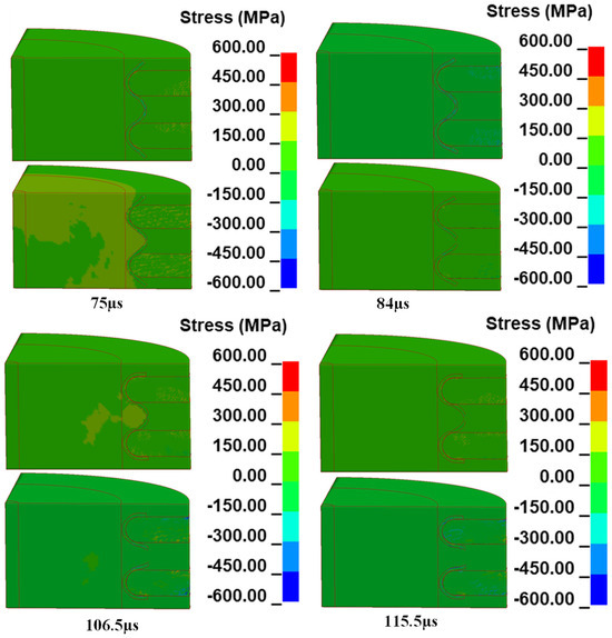 Figure 6 presents a comparison of the stress response at the notches of the current contact structures. As shown in the figure, both notch configurations reach their maximum forward compressive stress at 31.49 µs. The V-notch contact exhibits a higher peak compressive stress of 51.44 MPa, compared to 36.99 MPa for the R-notch contact. When the shock wave reaches the outer surface of the copper material, a tensile wave is reflected due to the presence of the free boundary.