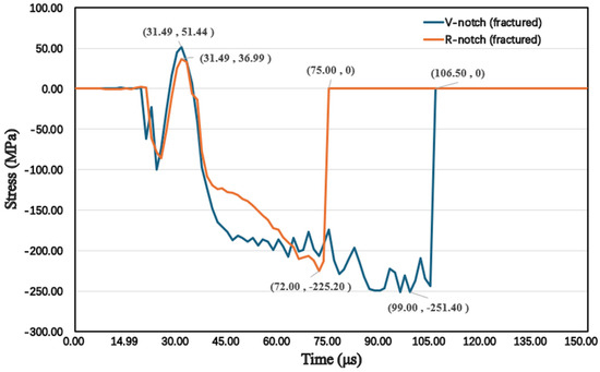 According to the stress curves, the R-notch contact reaches a maximum tensile stress of 225.20 MPa at 72 µs, while the V-notch contact reaches a higher tensile stress of 251.40 MPa at 99 µs. Following rupture, the internal stress of the contact rapidly drops to zero. As shown in Figure 6, the R-notch contact fractured at 75 µs, while the V-notch contact point failed at 106.5 µs, indicating that the R-notch is more prone to fracture than the V-notch. This result may be attributed to the gentler stress gradient at the root of the R-notch, which tends to form a more uniform stress field. Under the high strain rate of the shock wave, this stress distribution more readily triggers rapid crack propagation. The material cannot release stress through localized plastic deformation, leading to linear crack propagation along the notch root. This results in a short fracture path and minimal energy dissipation.