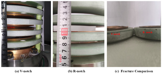 In this study, effective fracture of the current contact was achieved through the explosive shock wave, as shown in Figure 9, which illustrates the structural and morphological characteristics of the current contact in the pyro-breaker after dynamic fracture. Under explosive loading, the current contact undergoes controlled fracture at the prefabricated notch region, driven by the stress concentration effect. The experimental results show that the fracture morphology of current contact well with the numerical simulation results. Specifically, the fracture surface of the R-notch is more completely separated from the epoxy substrate compared to the V-notch, where a noticeable gap exists between the fracture surface and the epoxy substrate.