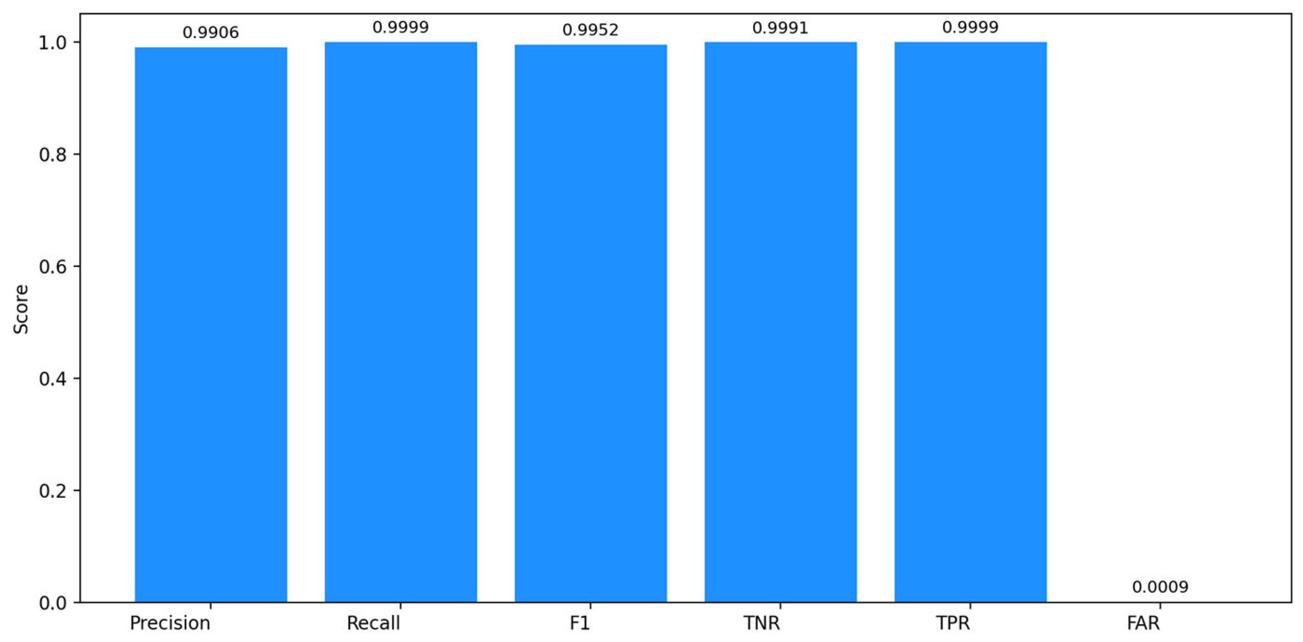 Figure 7). Benign traffic dominates the dataset, and the model achieves excellent detection for this class (Precision = 1.00, Recall = 0.999, FAR = 0.0), which is expected due to heavy class imbalance and highly separable feature profile.