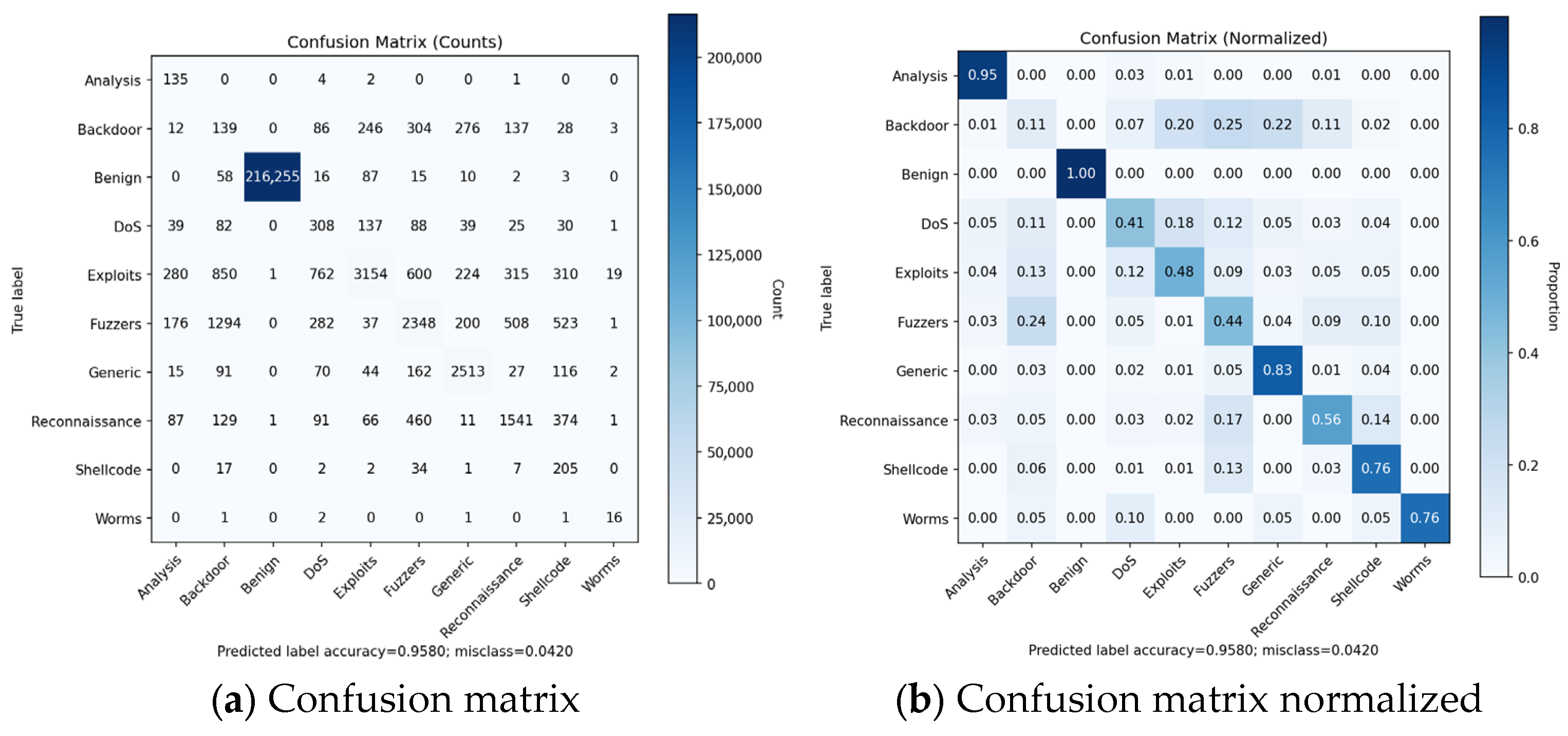 Table 6, indicating a high rate of false positives. This is consistent with their extremely small sample counts in the dataset, which limits the model’s ability to learn class-specific patterns from similar attack categories, such as Backdoor being misclassified as Fuzzers or Exploits. These classes also exhibit the highest FPR (Backdoor FAR = 0.011, Fuzzers FAR = 0.007, and Shellcode FAR = 0.006), and the model incorrectly assigns Benign or other attack flows to these categories. Classes with moderate frequency and structured behavioral signatures Generic, Reconnaissance, and Exploits show a more balanced performance. For example, Generic achieves the highest F1 of 0.796 among attack classes and a low FAR of 0.003, with Reconnaissance and Exploits indicating partial but not complete separation from neighboring classes. Their corresponding FPR values 0.004 and 0.003 suggest that FP is kept constrained.