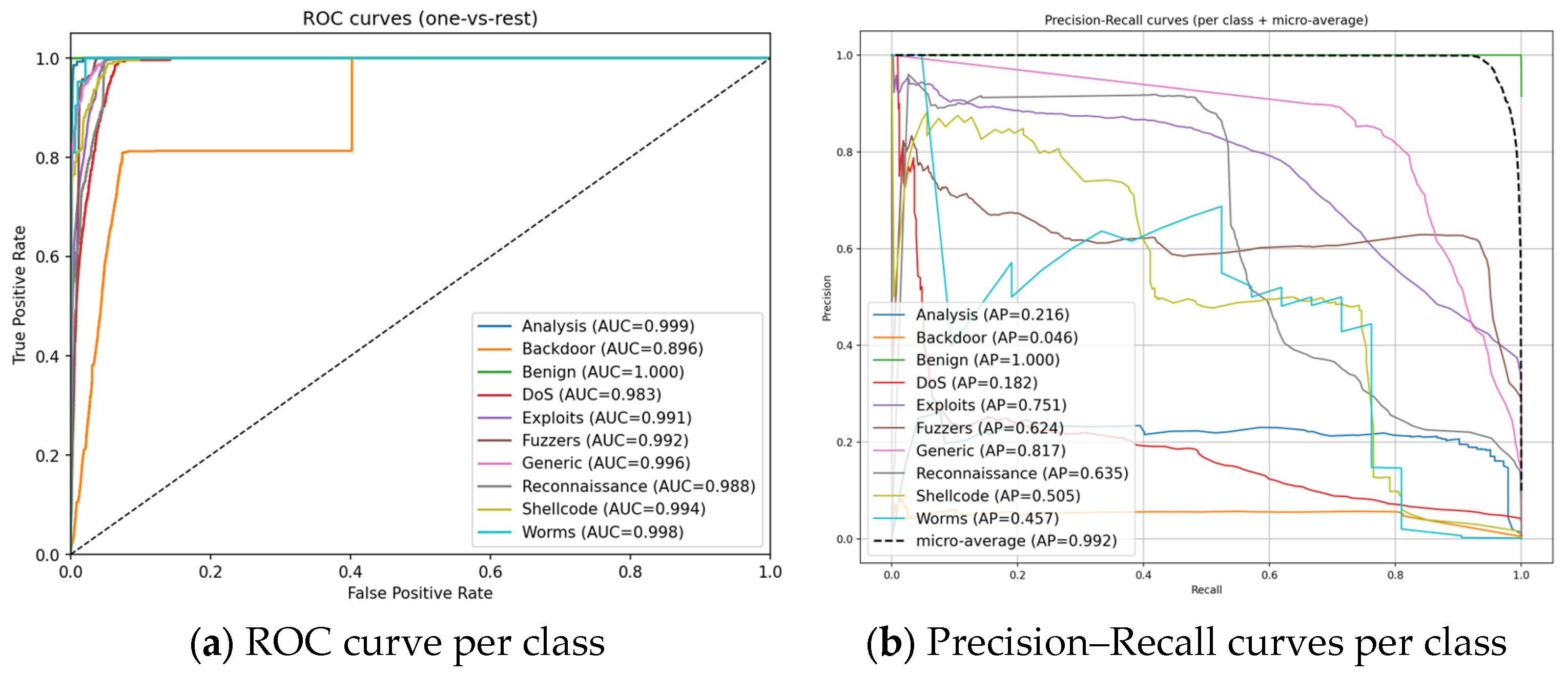 Figure 9a). Exploits and DoS have the lowest Recall, with errors primarily in Backdoor, Fuzzers, and Shellcode. Despite that, the ROC curves are uniformly high, with micro-average AUC = 0.999. The conclusion is that even difficult classes can be separated with very low FP rates. This indicates residual errors in the confusion matrix come from the temporal validation rather than a lack of discriminative signal.