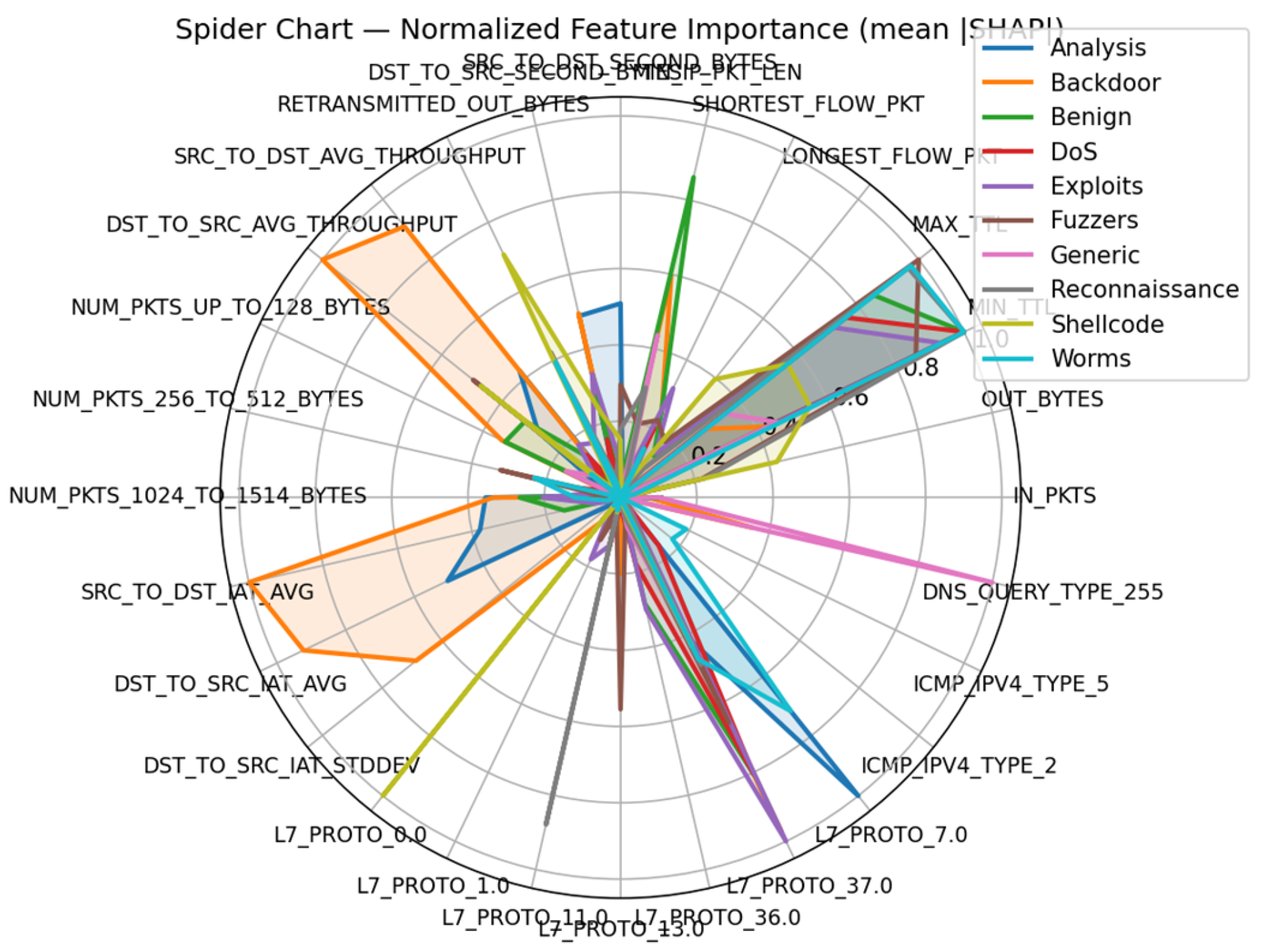 Figure 10. For the classes with the weakest performance such as Backdoor, DoS, and Fuzzers, SHAP reveals that their feature signatures are not strongly differentiated from other high-volume or burst-pattern attack classes. These classes exhibit broad distributions across byte-based and packet-based metrics (e.g., OUT_BYTES, IN_PKTS, SRC_TO_DST_SECOND_BYTES), indicating that the GNN does not identify a dominant, class-specific marker. This lack of distinctive flow-level patterns corresponds directly to their high FPRs (Backdoor FAR = 0.011, DoS FAR = 0.006, Fuzzers FAR = 0.007), where flows from these minority classes are frequently absorbed into more volumetric classes such as Exploits or Generic. Attack types with clear SHAP peaks on protocol features, Reconnaissance (DNS query types), Shellcode (ICMP codes), and Generic (with consistent TTL ranges), achieve significantly better F1 and lower FAR. Spider chart shows sharp spikes for these classes in features like DNS_QUERY_TYPE_255, ICMP_IPV4_TYPE_2, and TTL metrics, reflecting stable behavioral signatures that the GNN reliably captures. This explains their comparatively higher discriminability despite the dataset imbalance.