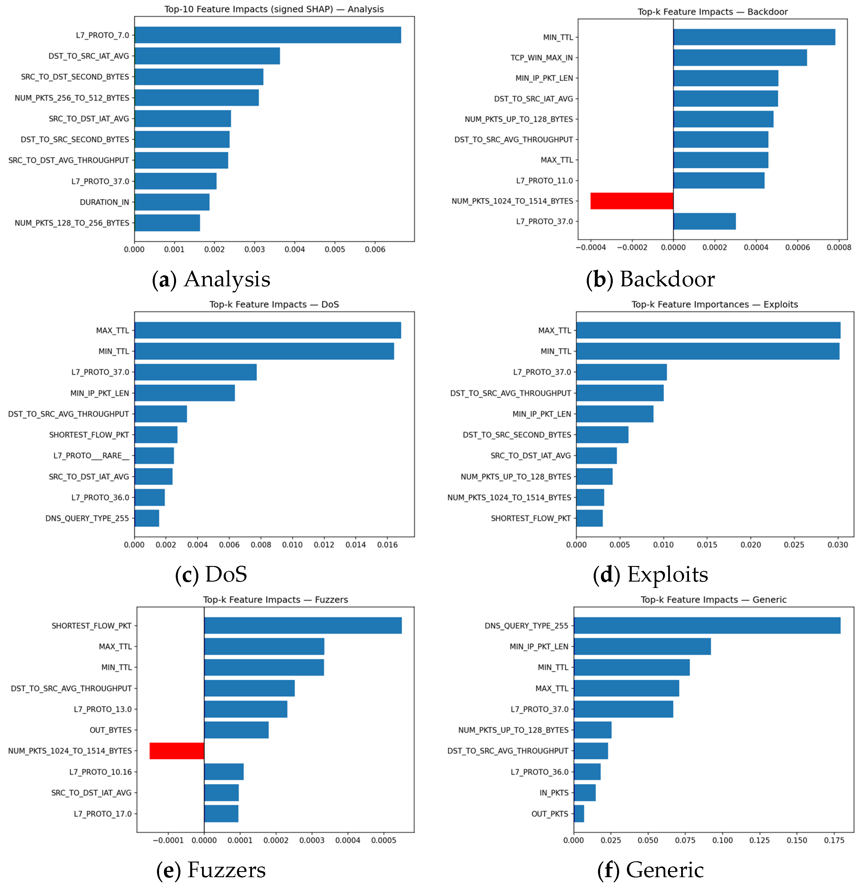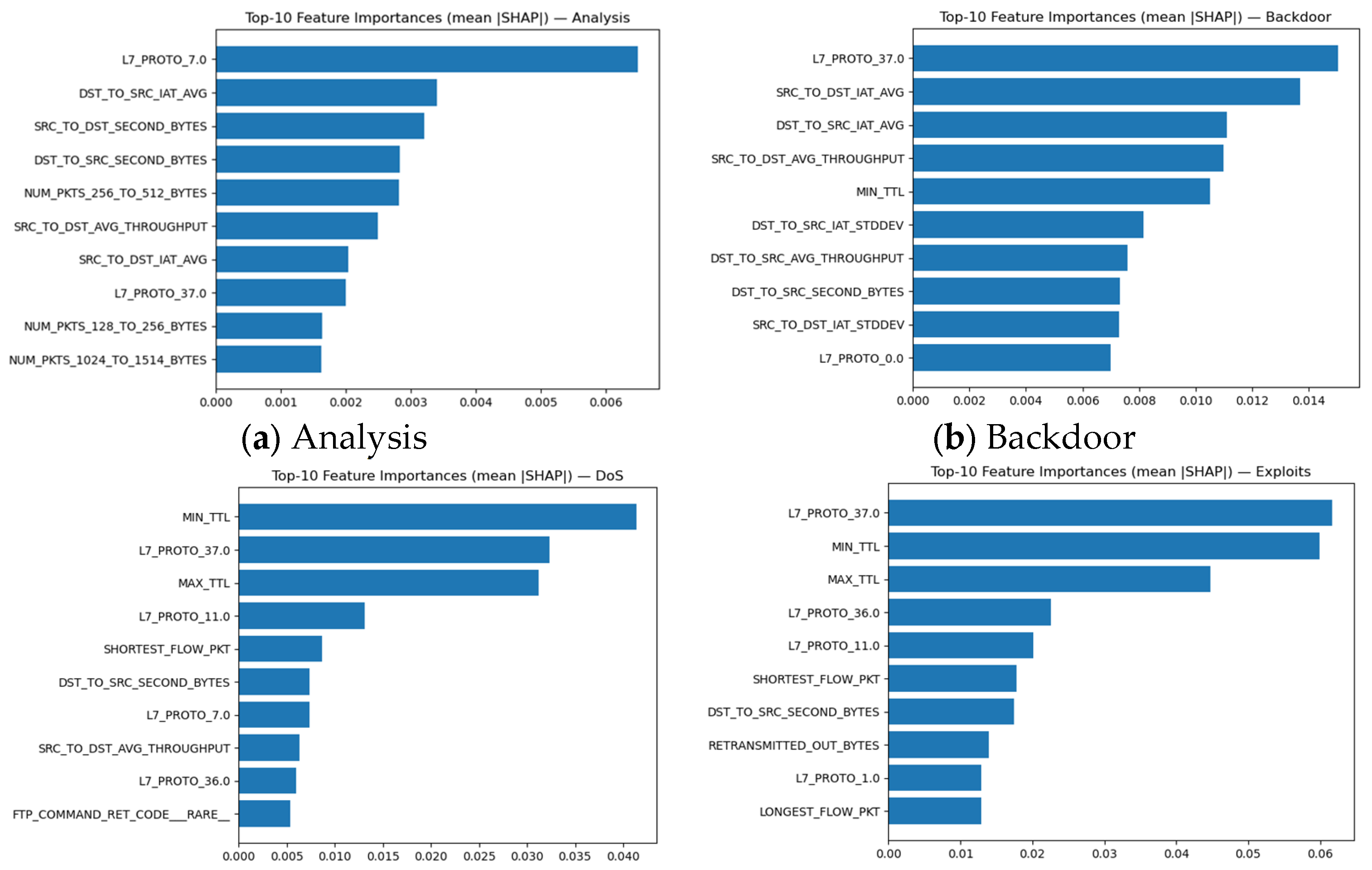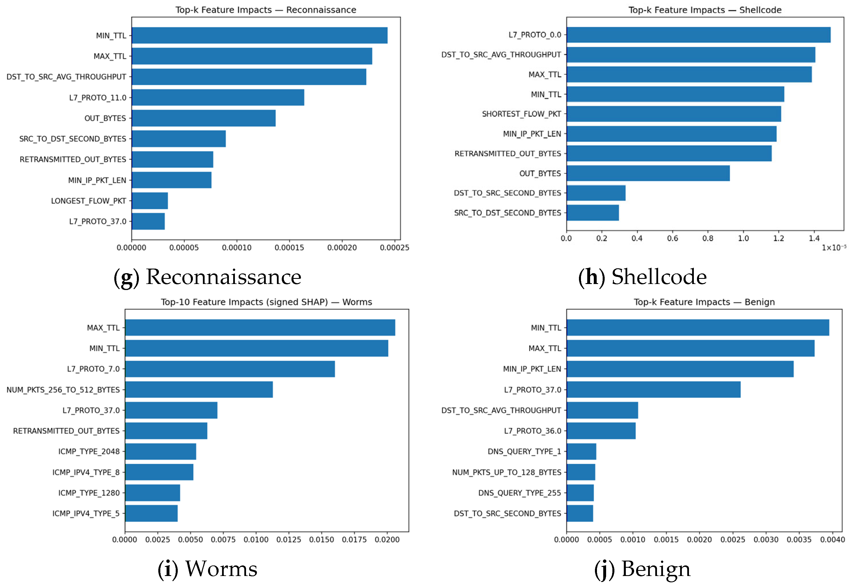 Fuzzers shows SHAP peaks at MAX_TTL, MIN_TTL, L7_PROTO_37.0, L7_PROTO_13.0, DST_TO_SRC_AVG_THROUGHPUT, and SRC_TO_DST_SECOND_BYTES. This signature overlaps with Exploits, Generic, and DoS flows. TTL instability and protocol-categories dominate the attribution, making the model sensitive to benign protocol variations and causing normal traffic with uncommon TTL and protocol combinations to be mislabeled as Fuzzers. In all three high-FPR classes, SHAP reveals broad, non-distinctive feature profiles, dominated by generic TTL irregularities, protocol-category (L7_PROTO_*), and basic throughput or inter-arrival statistics.