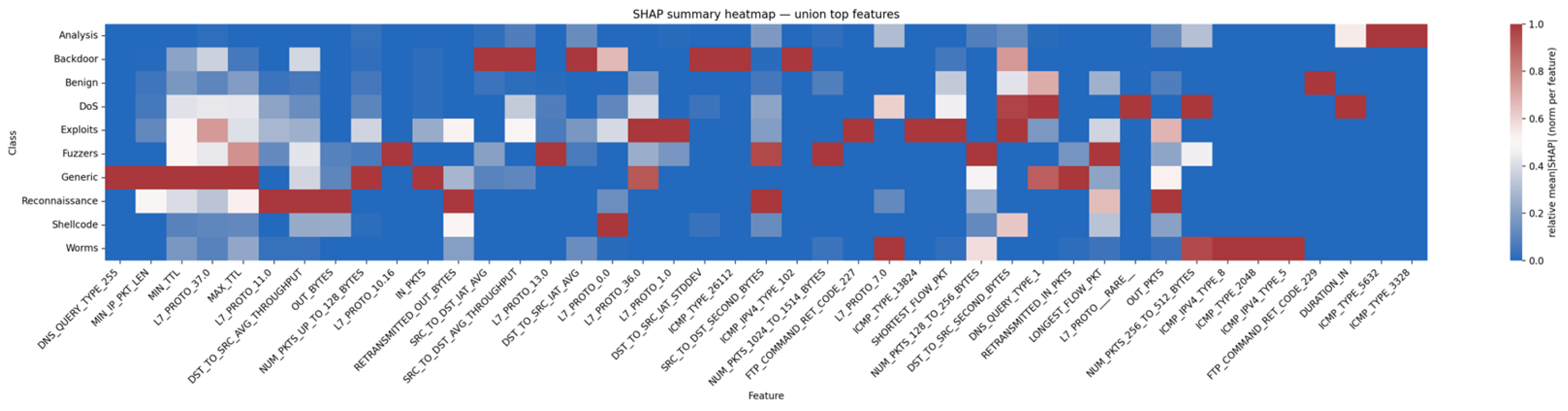 Finally, classes with moderate recall but moderate precision (such as Worms) show SHAP signatures are dominated by a small subset of features (specific ICMP types), suggesting that the GNN identifies their behavior only when these rare indicators are present. This explains high recall (0.762 for Worms) paired with the moderate precision of 0.372 where the model recognizes distinctive spikes but struggles when flows deviate from these forms.