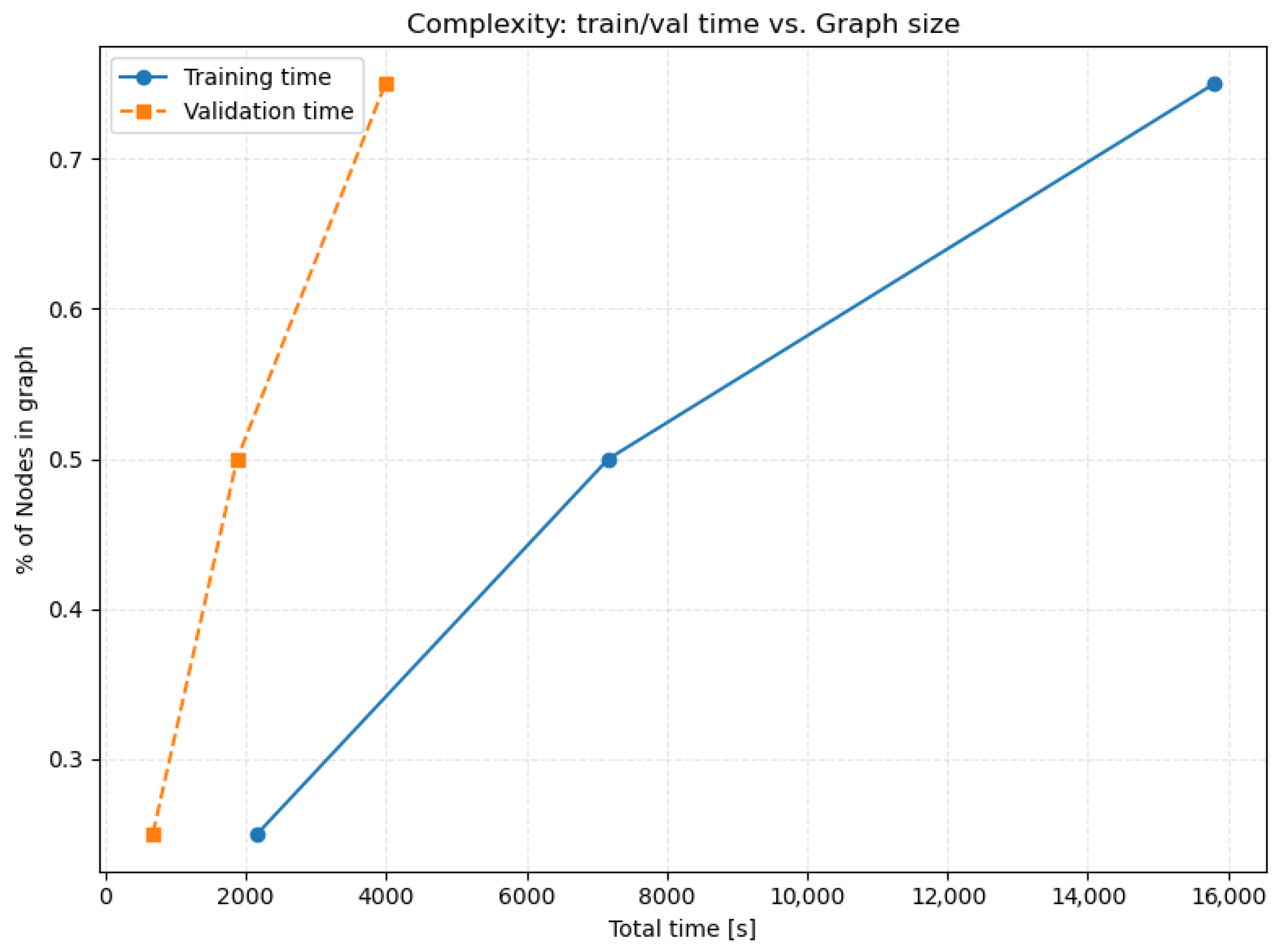 Figure 14), reflecting the cost of neighborhood sampling and message passing in our two-hop model. As the number of nodes increases from roughly 25% to 75% of the full NetFlow graph, total training time grows almost linearly, consistent with the expected