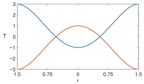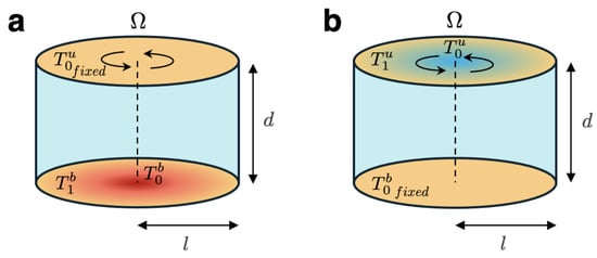 In both configurations, horizontal and vertical thermal gradients are imposed. The vertical temperature difference is defined as . At the lower boundary, a central hot region is introduced using a Gaussian temperature profile (see dimensionless mathematical expression in Equation (6)), which reaches a maximum value at and the value at . A lateral thermal variation is introduced at the base of the cylinder, defined as . Similarly, at the upper boundary, a cold region is imposed at the center using another Gaussian temperature profile (see Equation (8)), with a minimum value at and a maximum value at . The horizontal temperature difference at the top is defined as . To characterize the relative strength of the horizontal gradients with respect to the vertical gradient, we introduce the dimensionless parameters and . In case A, the upper reference temperature is held constant, while in case B, the bottom temperature is fixed. In both cases, we denote the fixed reference temperature as .
