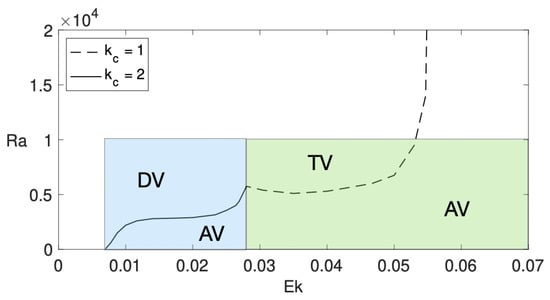 Figure 4 displays the bifurcation diagram in the plane Ra-Ek for case A. The bifurcation diagram for case B is analogous. As observed, there are three clearly differentiated regions, depending on : , , and . For the instability occurs through an oscillatory bifurcation of wave number (solid line), and for , the instability occurs through an oscillatory bifurcation of wave number (dashed line). Below the bifurcation lines the state found is axisymmetric.