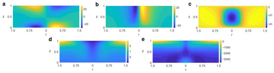 The operators in Equations (1)–(3) are expressed in cylindrical coordinates and denote the unit vector in the vertical z direction. Several dimensionless numbers are introduced to characterize the flow: the Prandtl number , the Ekman number , and the Rayleigh number , where is the coefficient of volume expansion and g is the gravitational acceleration.