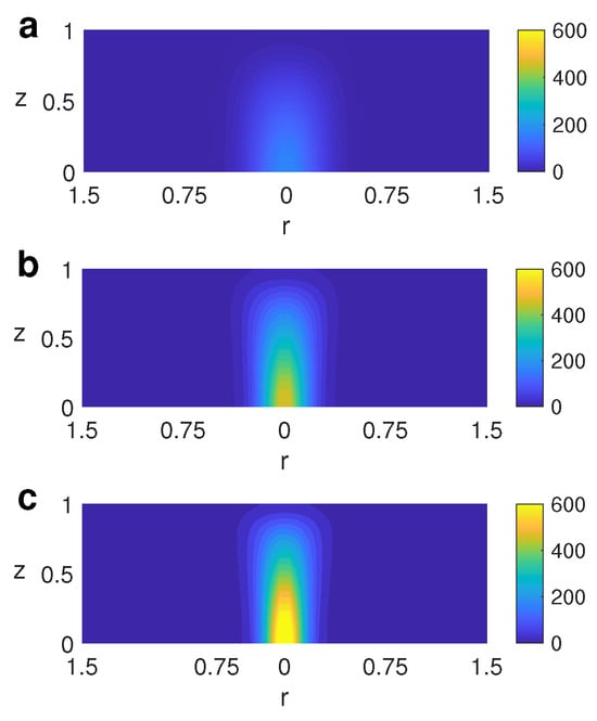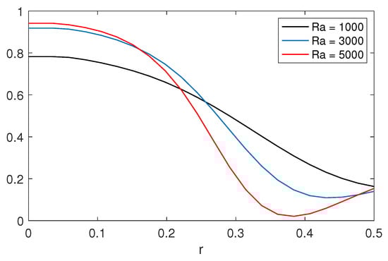 Figure 7 displays the profiles of the vertical component of the vorticity when is varied for the case where a thermal inhomogeneity is located at the bottom (case A). As is expected, the magnitude of the vertical vorticity increases with , which implies a more intense spin of the structure around the cylinder’s axis.