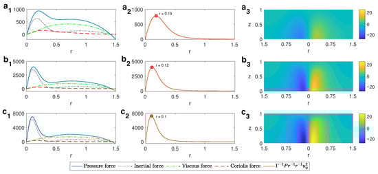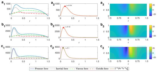 This intensification can be explained by taking a look, at lower z levels, at the terms from the radial component of the momentum equation: the pressure force , the Coriolis force , the inertial or friction force , and the viscous force . As can be seen in the left column in Figure 8 for and different values of , the positive radial pressure gradient is balanced by the Coriolis and inertial forces (the latter essentially corresponds to the centrifugal term displayed in the central column of Figure 8). As the thermal gradients increase, the radial pressure gradient increases, and so does the centrifugal force that balances it in the central region of the cell. This implies a more intense cyclonic motion close to the cylinder axis as the thermal gradients grow, leading, consequently, to a more intense vortex.