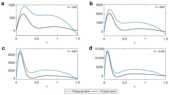 Interestingly, we observe that this contraction eventually halts, even though the azimuthal velocity continues to increase as the vortex intensifies. This phenomenon is depicted in Figure 10, which shows azimuthal velocity profiles for different values. The primary mechanism preventing further contraction of the RMAV is the frictional force, as shown in Figure 11. Once this force balances the inward advection caused by radial inflow—by counteracting the radial pressure gradient—the RMAV stabilizes and maintains a stationary value, despite continued vortex intensification. Although our results correspond to stationary states, they align with the behavior observed in the evolution of hurricanes, particularly the radius of maximum tangential wind (RMW). As reported in Ref. [32], the RMW contracts continuously during the early stages of intensification, slows abruptly midway through the process, and eventually stabilizes, even as rotational flows continue to strengthen.