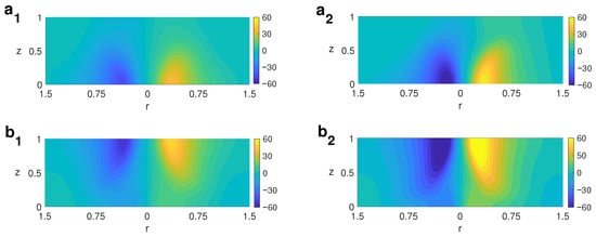 For larger ambient rotation rates, , the axisymmetric vortex bifurcates through a Hopf bifurcation of wavenumber (Figure 4), and the new periodic structure found consists of a double vortex (DV) spinning around the central axis. The transition occurs this way: the axisymmetric vortex loses its symmetric shape and adopts an elliptic form. The vortex keeps widening as increases, and finally, it splits into two vortices. Figure 17 displays the profile of the azimuthal velocity for two different values of for for both cases A and B, showing the double vortex developing from the bottom up in the case of a heating spike at the bottom (Figure 17a) and from the top down in the case of a cool pool on the top (Figure 17b). It is noted that as increases, the double structure intensifies and grows in the vertical direction. The development of a double vortex is associated with large ambient rotation rates.
