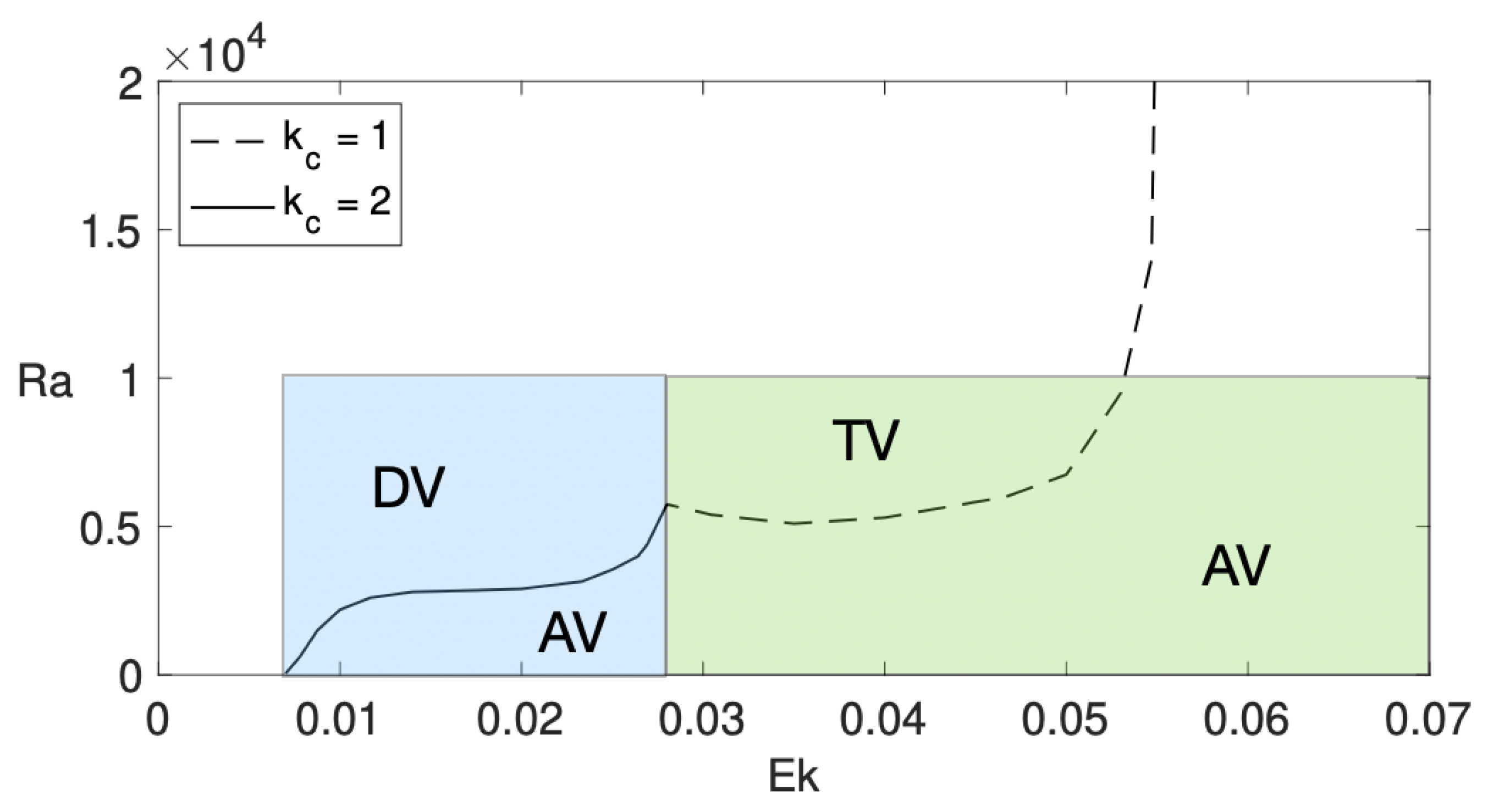 - Rudinger, S.; Knobloch, E. Mode interaction in rotating Rayleigh-Bénard convection. Fluid Dyn. Res. 2003, 33, 477–492. [Google Scholar] [CrossRef]
