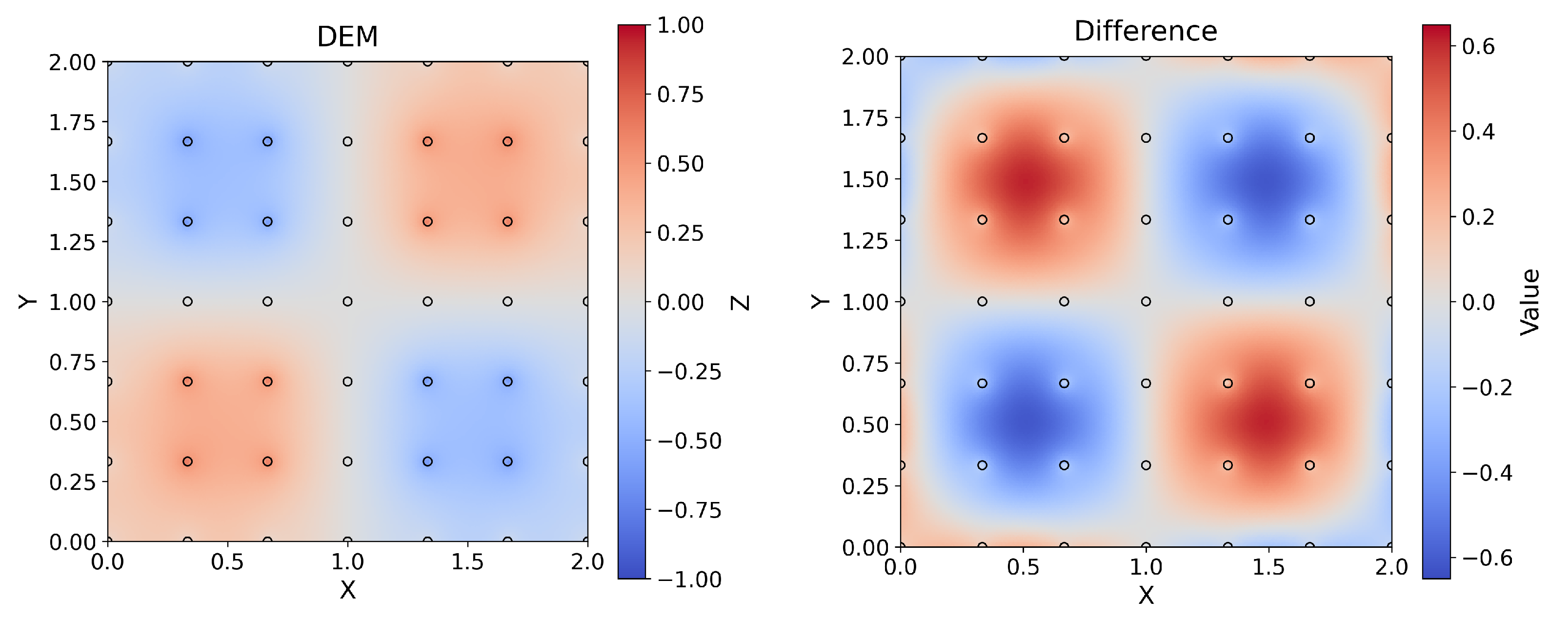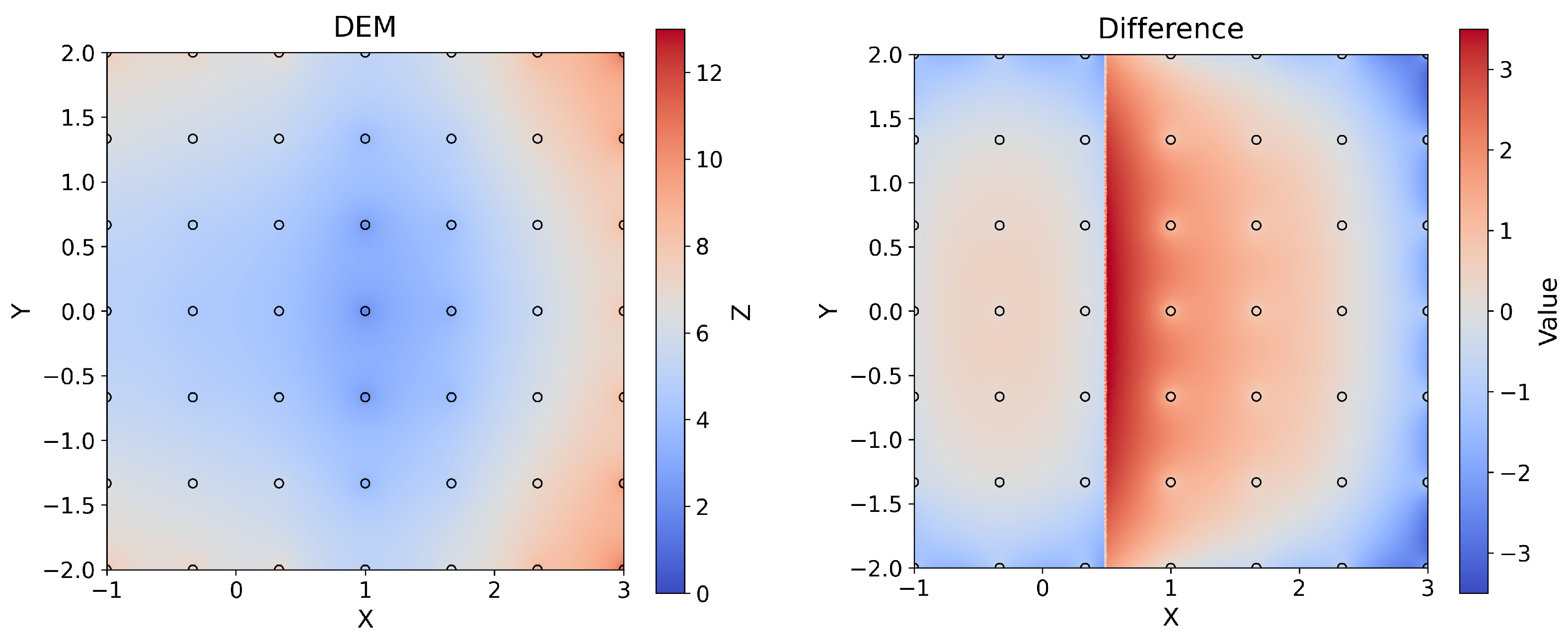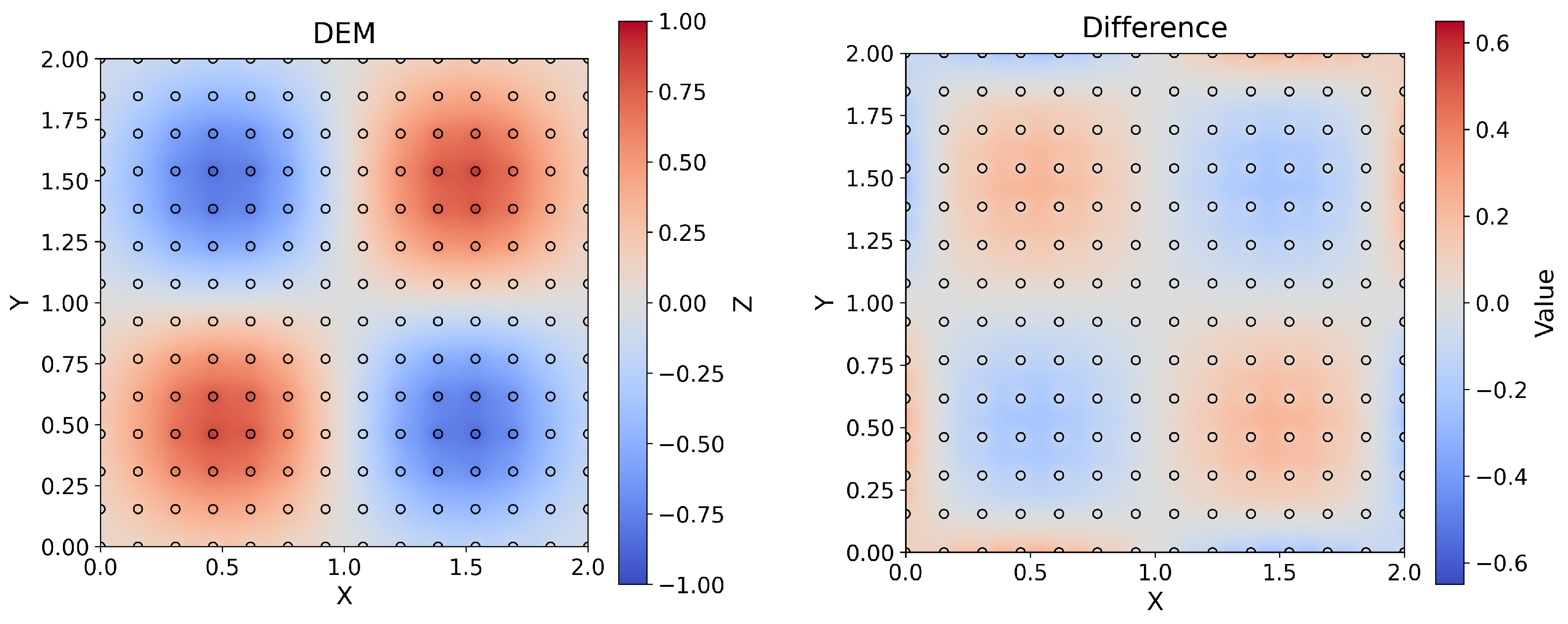 As a direct consequence of this harmonic formulation, the Poisson-based reconstruction acts as a low-pass filter on the elevation field. High-frequency components of the surface are progressively attenuated, strong local slopes tend to be underfitted, and sharp transitions or discontinuities are smoothed out. This behaviour is inherent to the minimisation of gradient variations and should therefore be regarded as a defining characteristic of the method rather than a numerical shortcoming. The impact of this regularisation becomes increasingly apparent in the numerical examples presented below, particularly in cases involving abrupt elevation changes or highly irregular sampling.