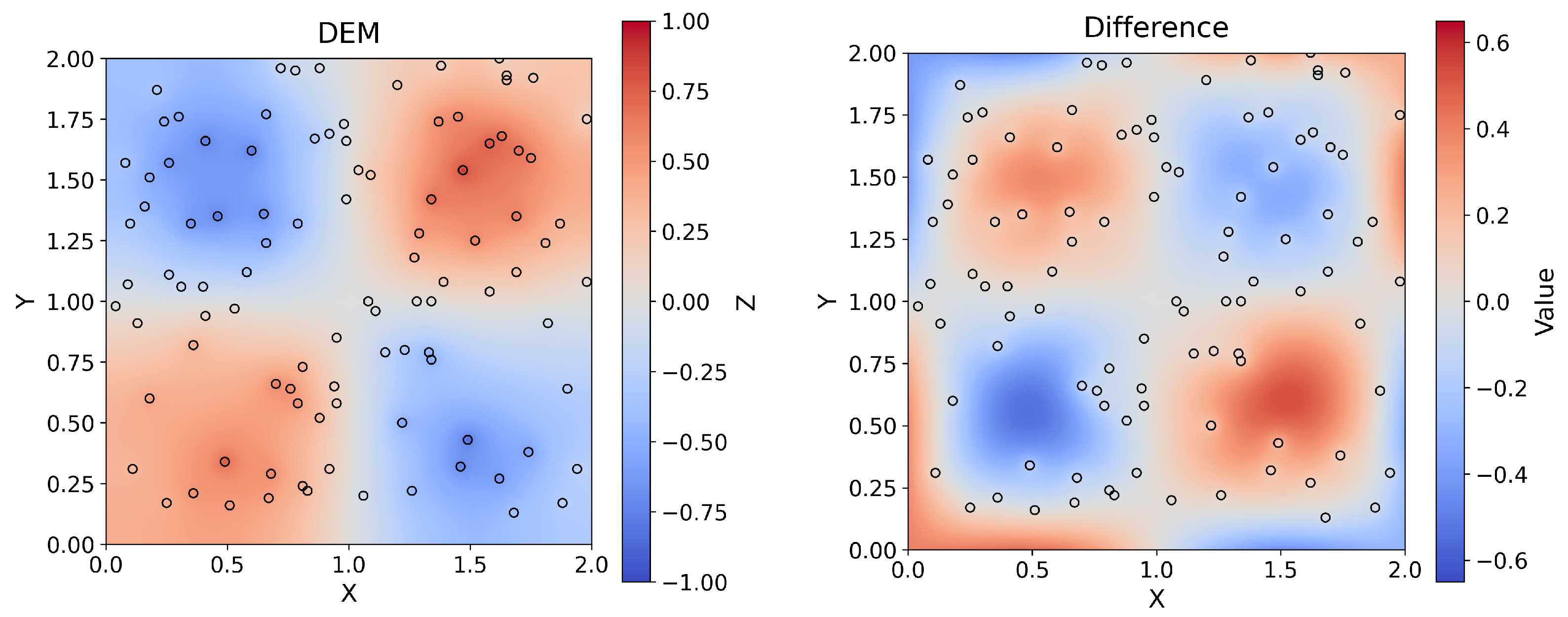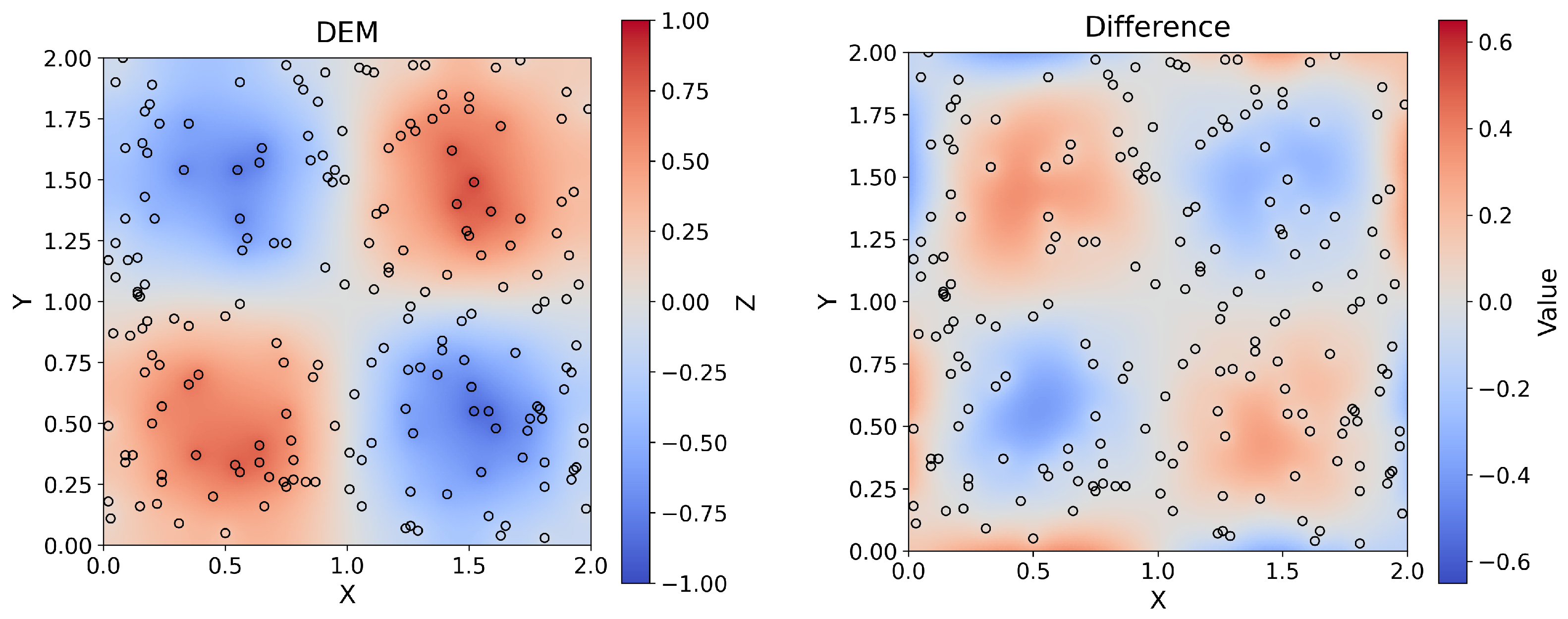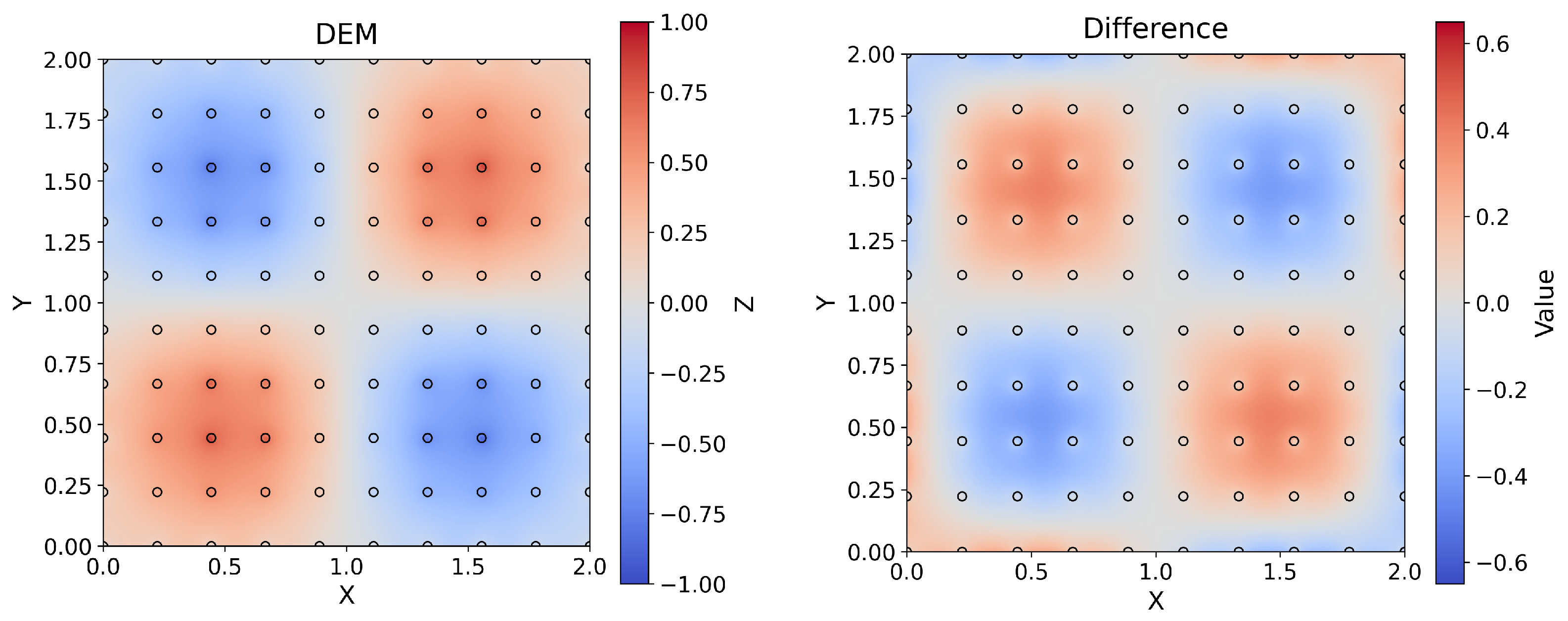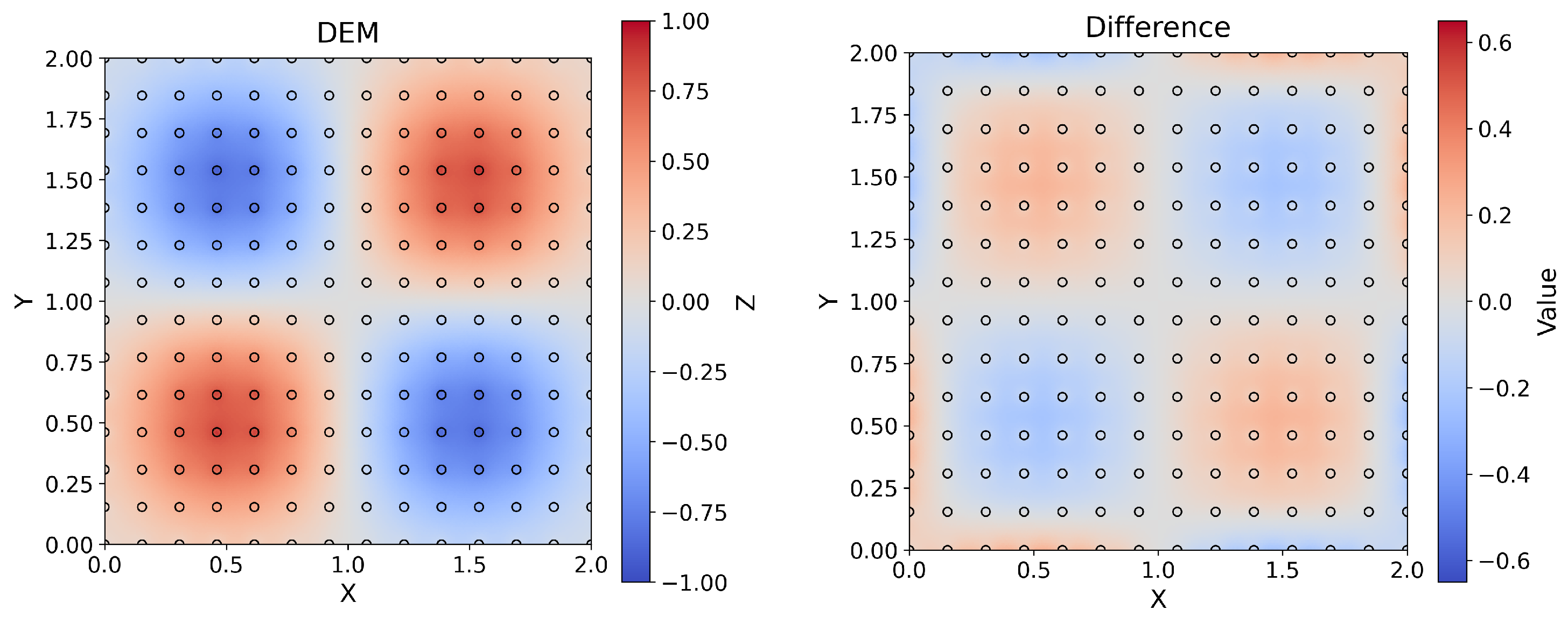 As a direct consequence of this harmonic formulation, the Poisson-based reconstruction acts as a low-pass filter on the elevation field. High-frequency components of the surface are progressively attenuated, strong local slopes tend to be underfitted, and sharp transitions or discontinuities are smoothed out. This behaviour is inherent to the minimisation of gradient variations and should therefore be regarded as a defining characteristic of the method rather than a numerical shortcoming. The impact of this regularisation becomes increasingly apparent in the numerical examples presented below, particularly in cases involving abrupt elevation changes or highly irregular sampling.