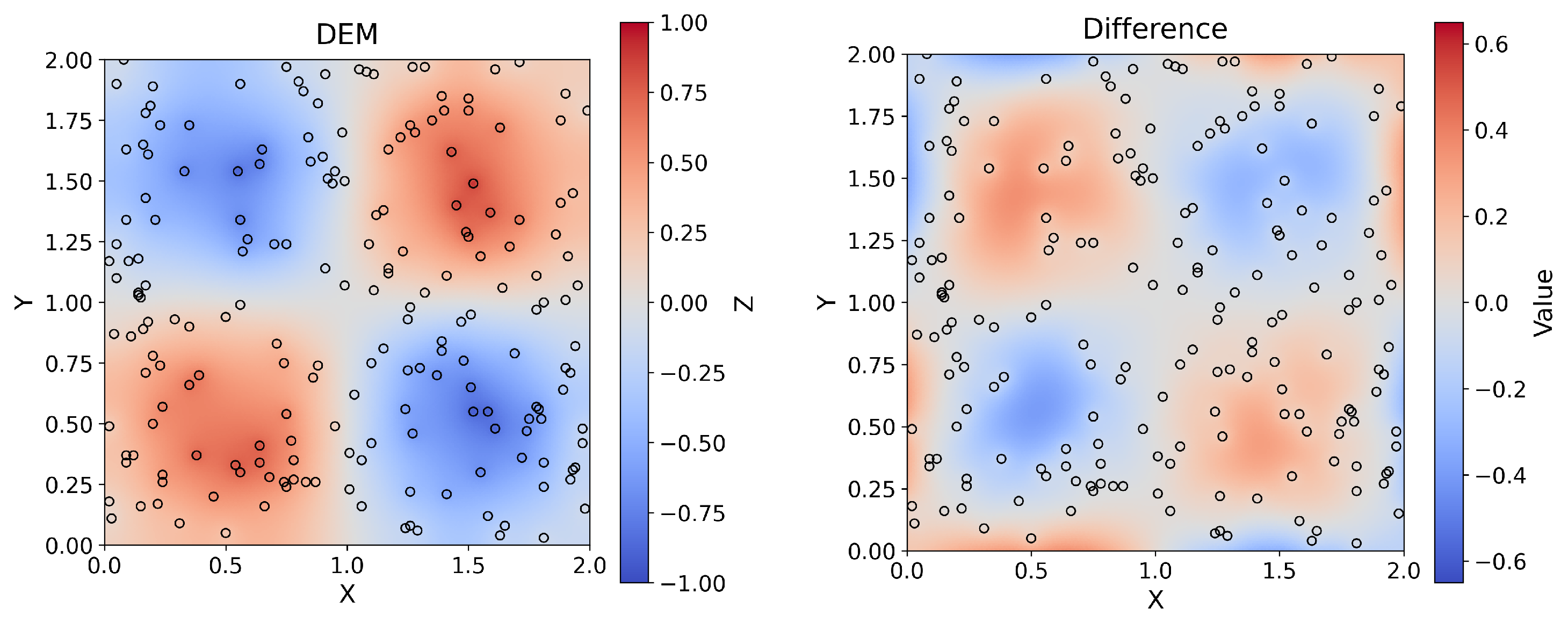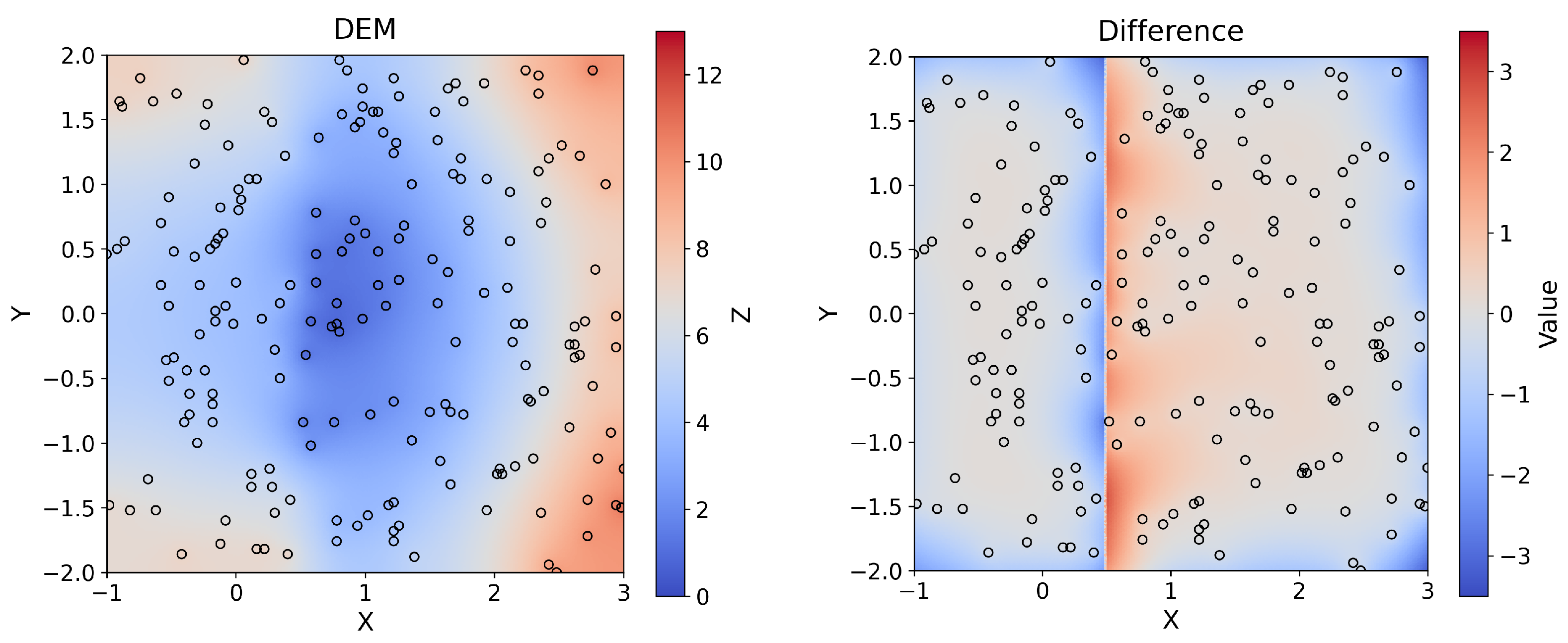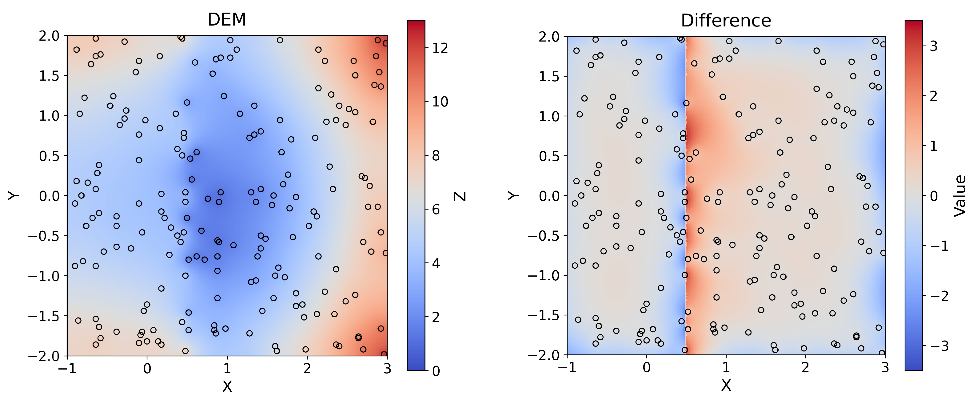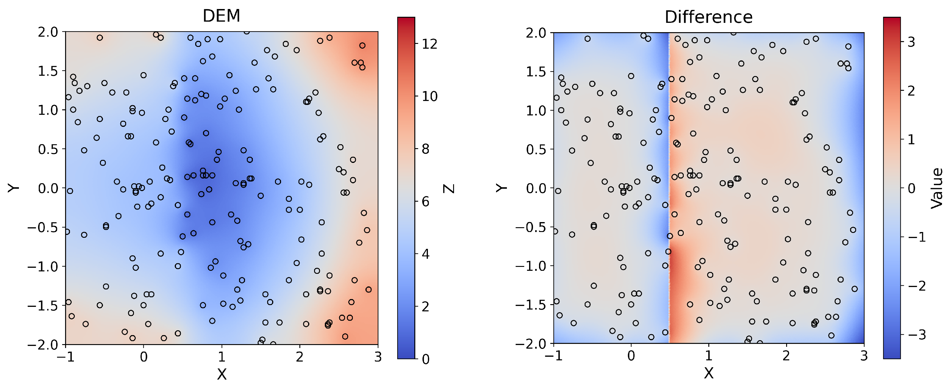 15], which use the Poisson equation to recover a closed surface from oriented points in three-dimensional space, the present formulation is strictly two-dimensional and designed for planar terrain interpolation. The unknown field represents the elevation, and the governing equation is interpreted as a harmonic interpolation model rather than a volumetric reconstruction. This distinction makes the proposed method computationally lighter, conceptually simpler, and directly applicable to DEM generation.