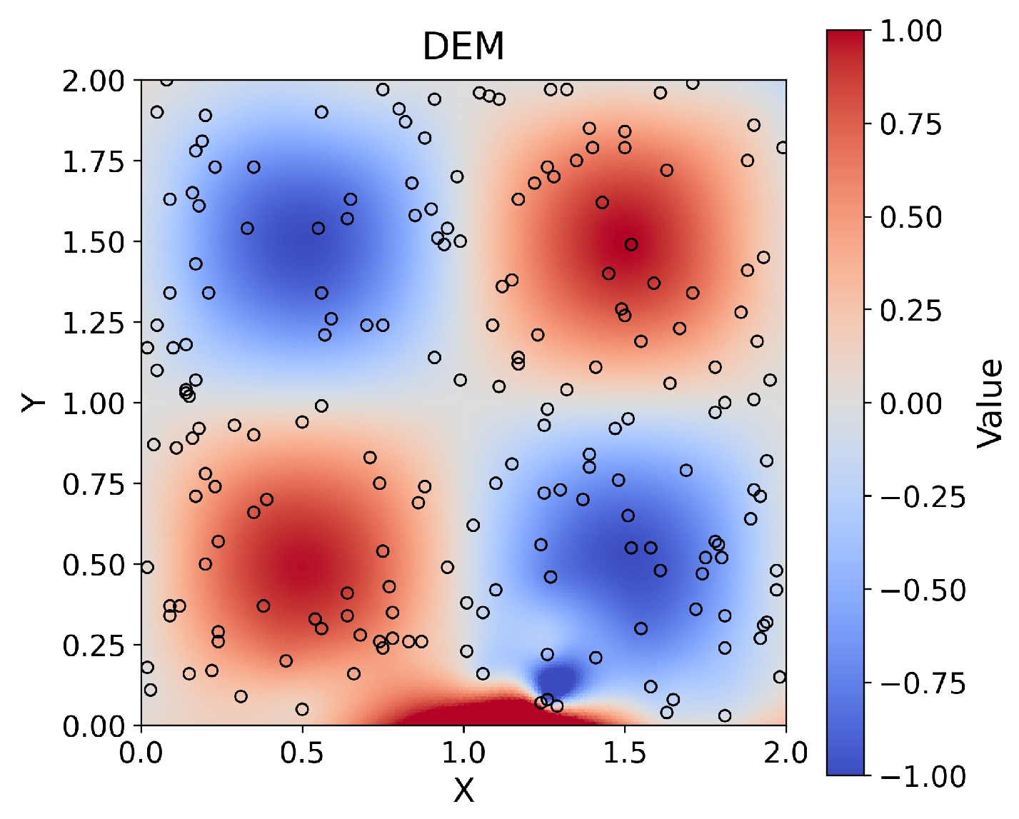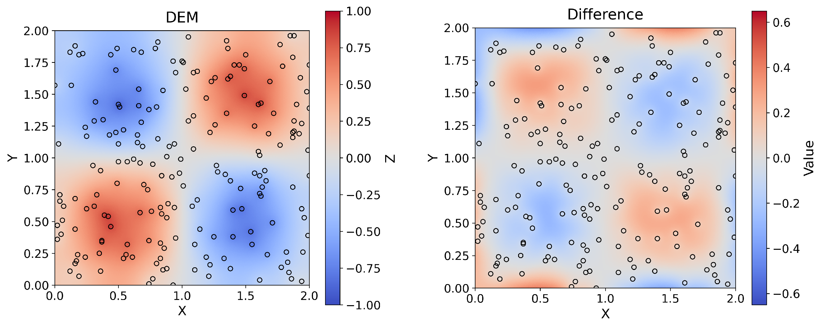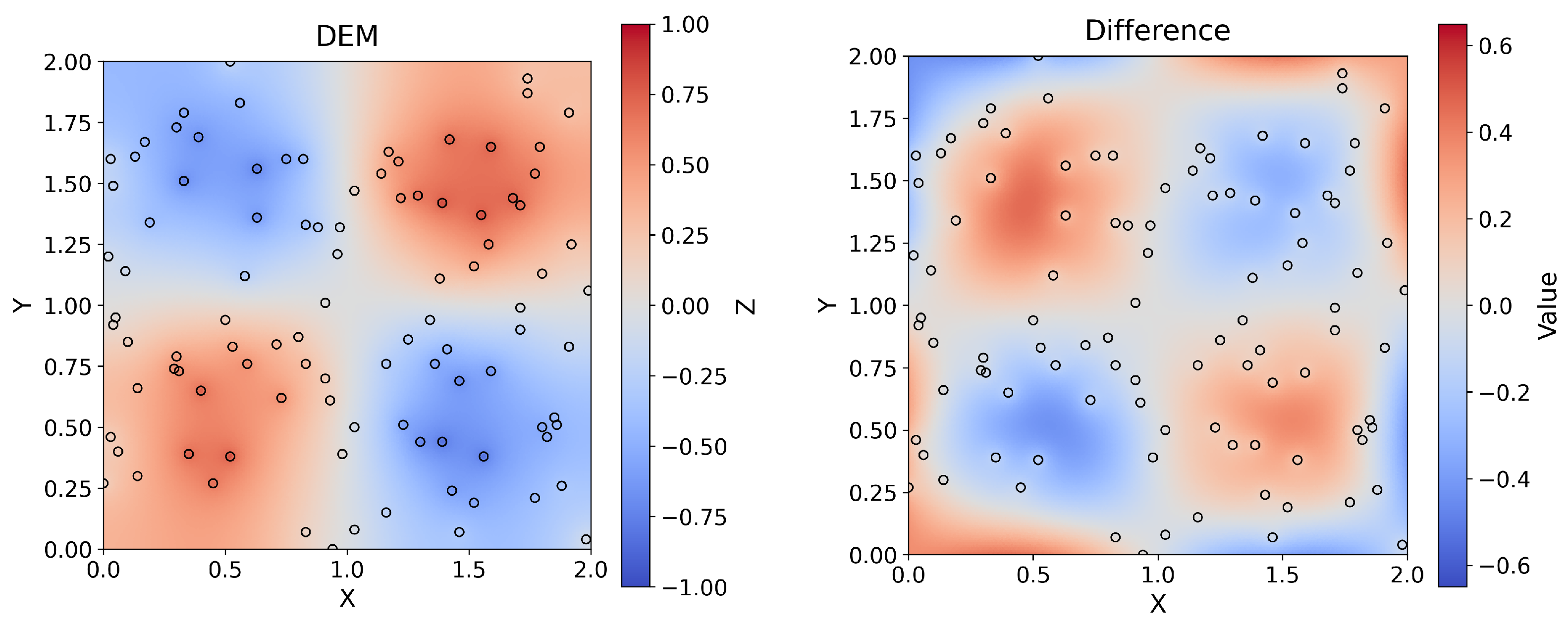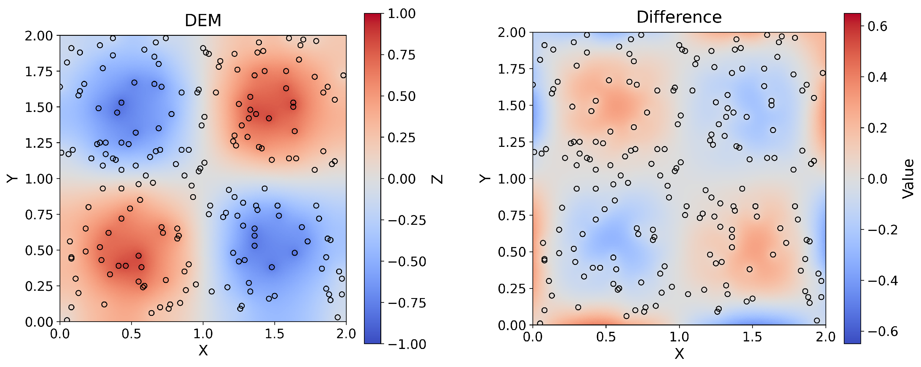15], which use the Poisson equation to recover a closed surface from oriented points in three-dimensional space, the present formulation is strictly two-dimensional and designed for planar terrain interpolation. The unknown field represents the elevation, and the governing equation is interpreted as a harmonic interpolation model rather than a volumetric reconstruction. This distinction makes the proposed method computationally lighter, conceptually simpler, and directly applicable to DEM generation.