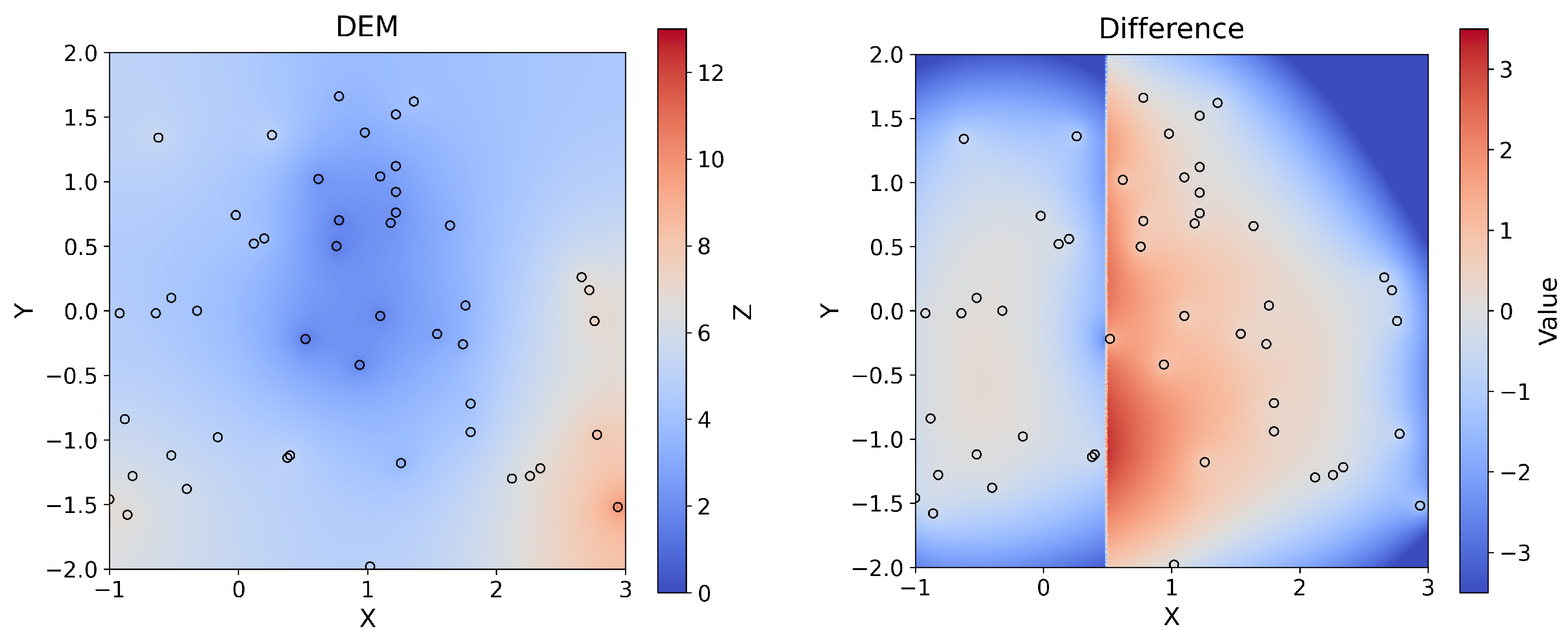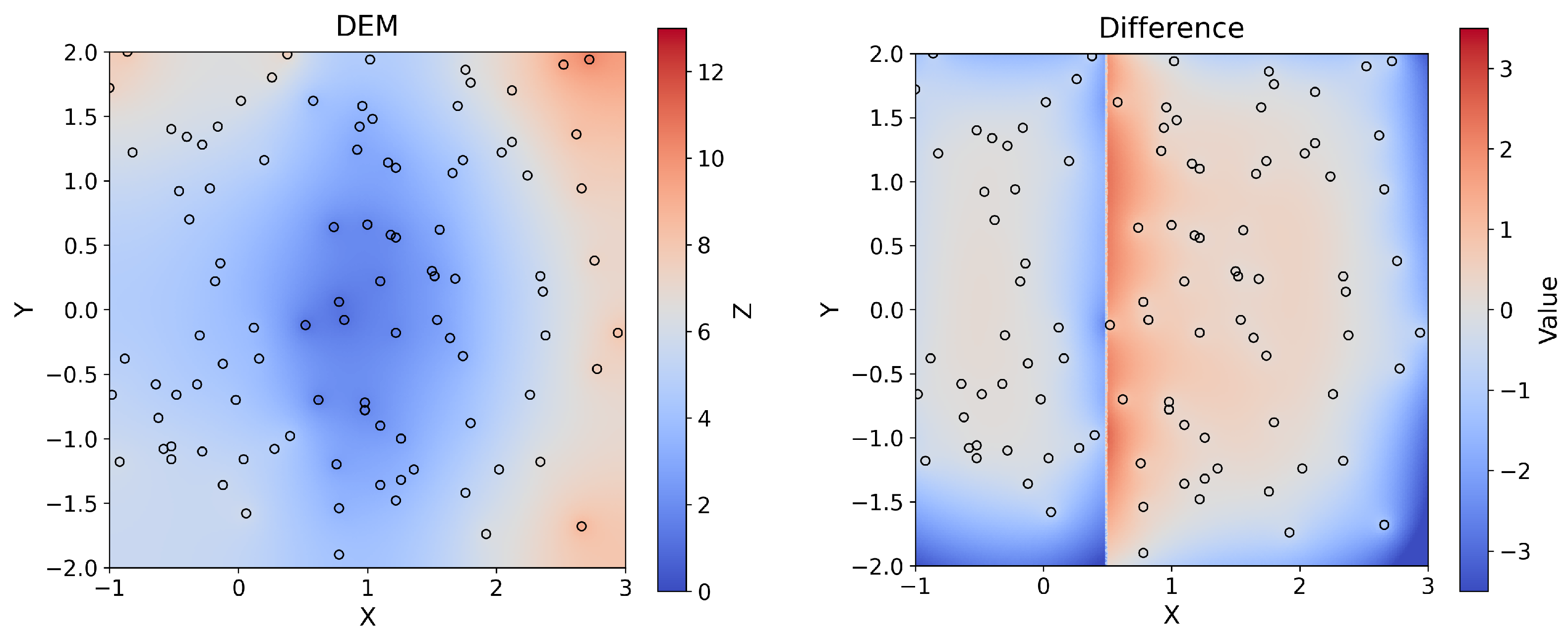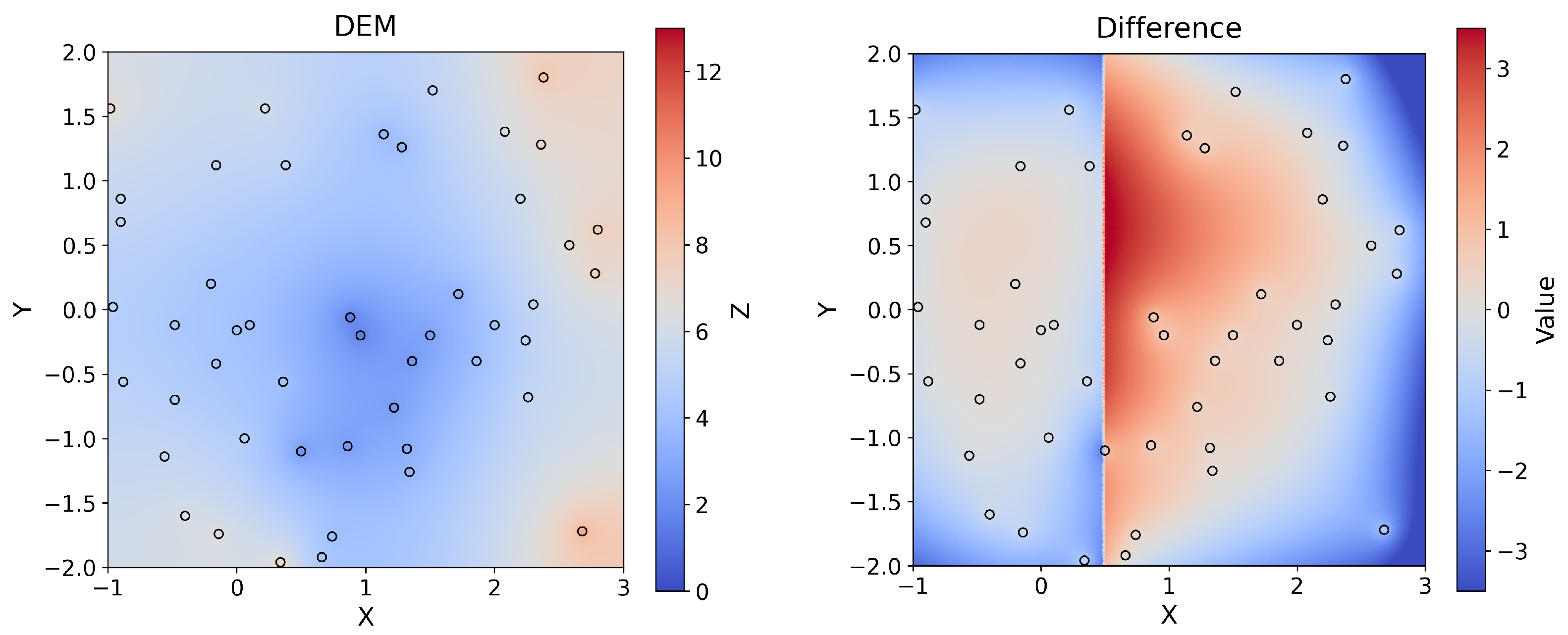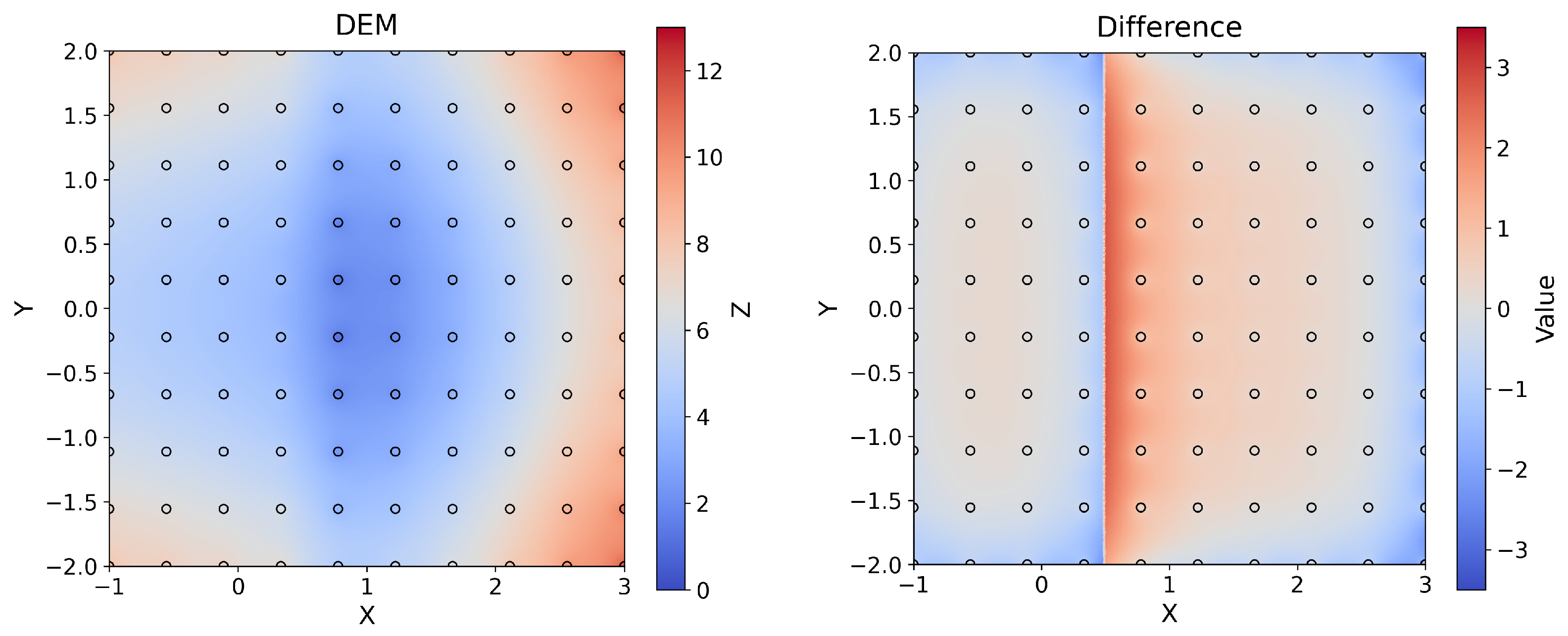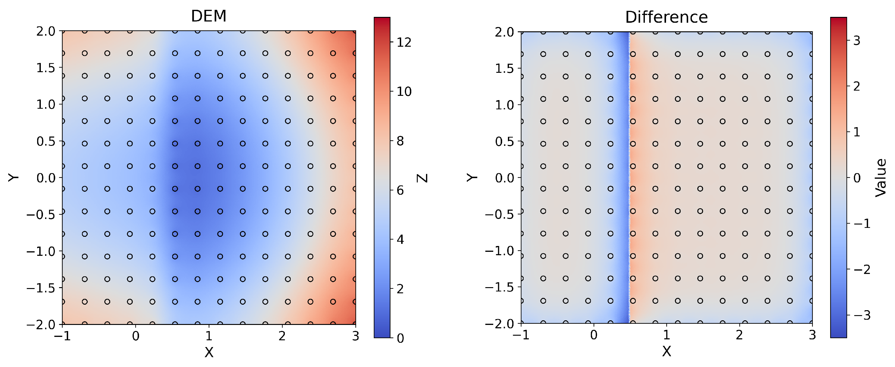 Appendix A. The image on the left illustrates the reconstructed surface obtained with each interpolation method, while the image on the right displays the contour map of the differences with respect to the analytical reference function. These differences constitute interpolation errors with respect to the analytical surface; however, they reflect the intrinsic regularization imposed by the harmonic formulation rather than a numerical deficiency of the method. The objective is not to reproduce the exact pointwise values of the analytical function, but to capture its essential geometric features in terms of elevation and slope continuity.