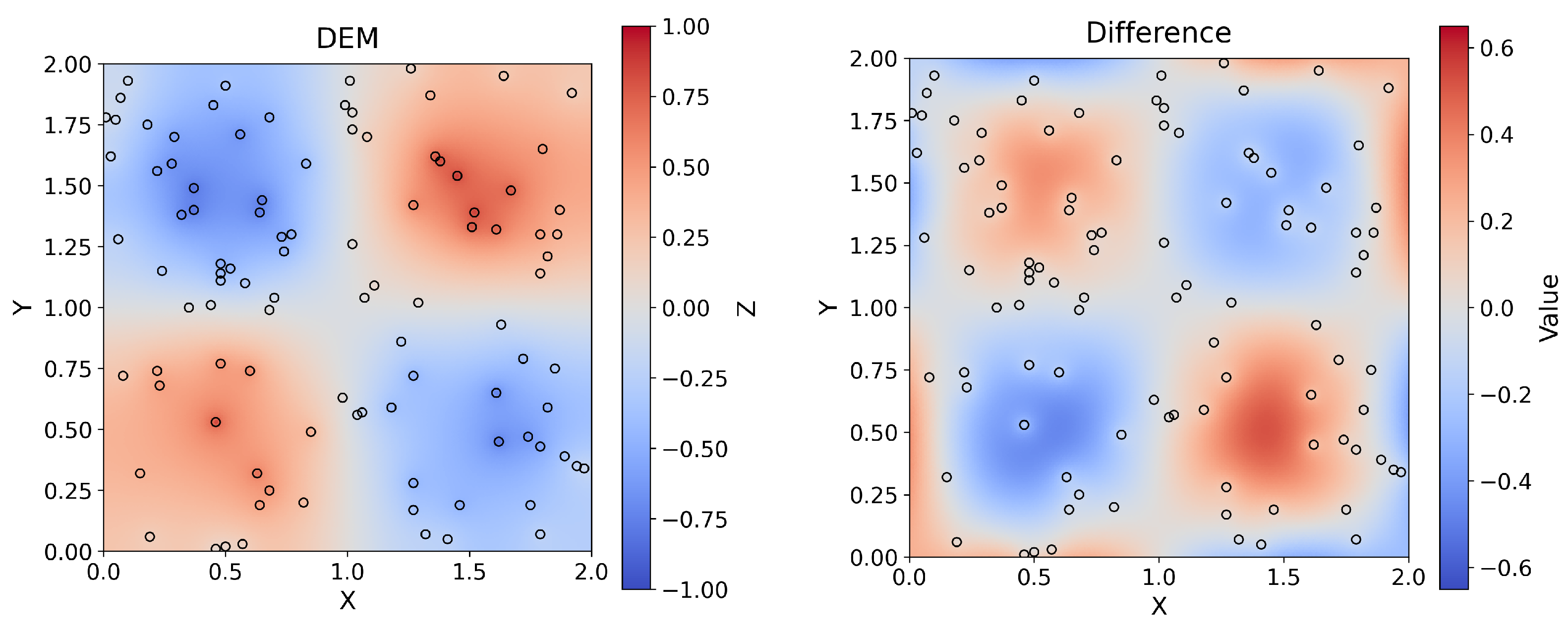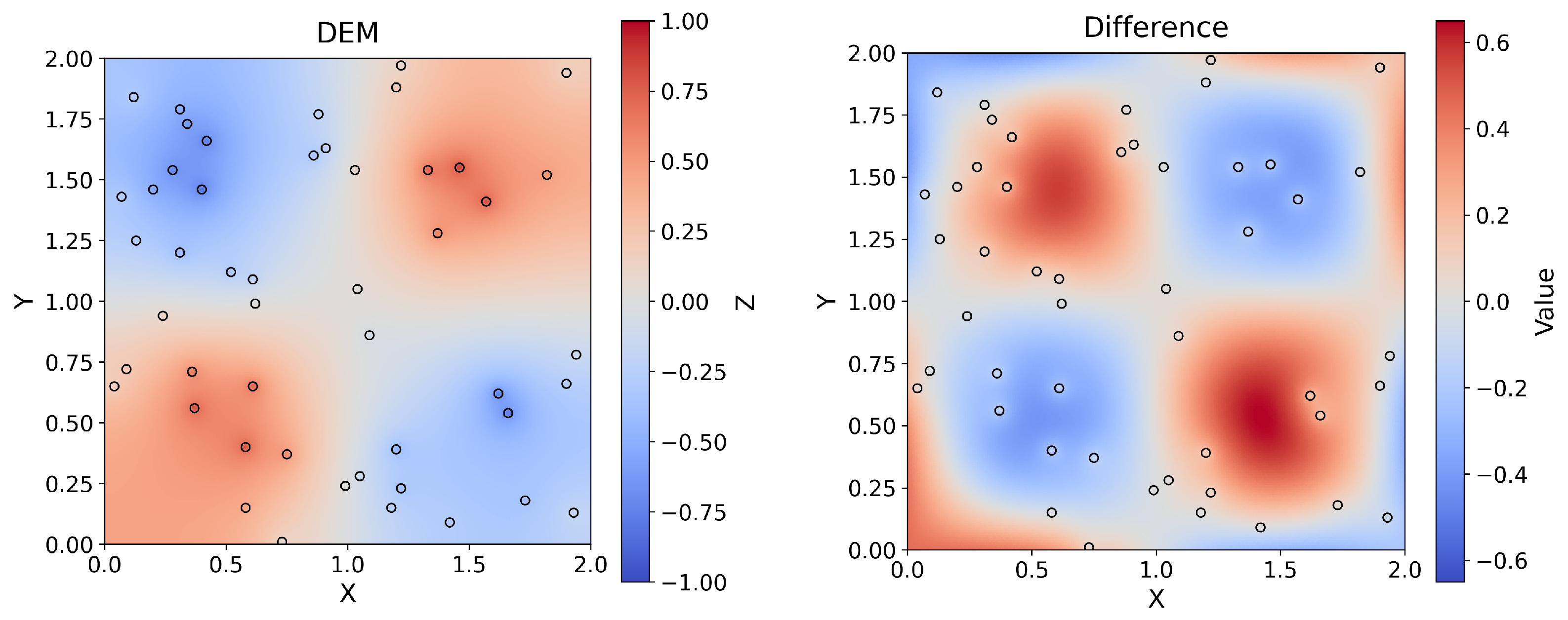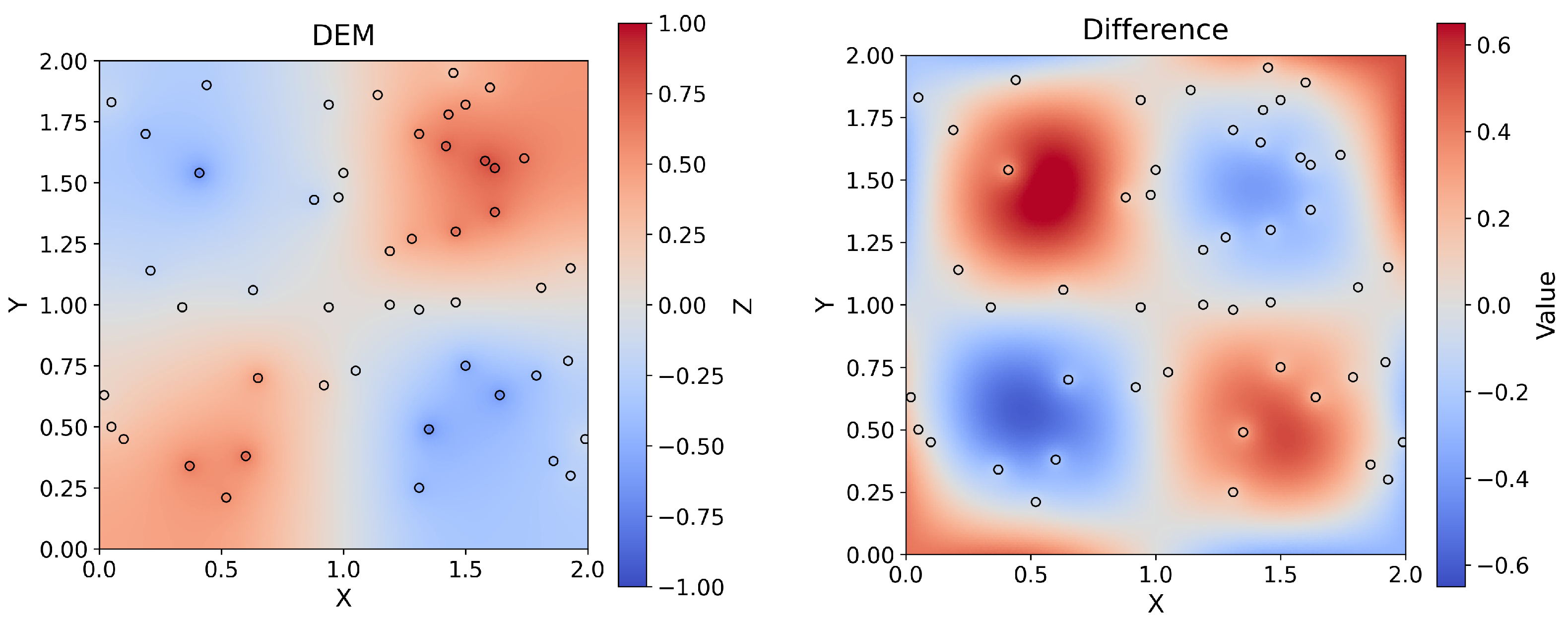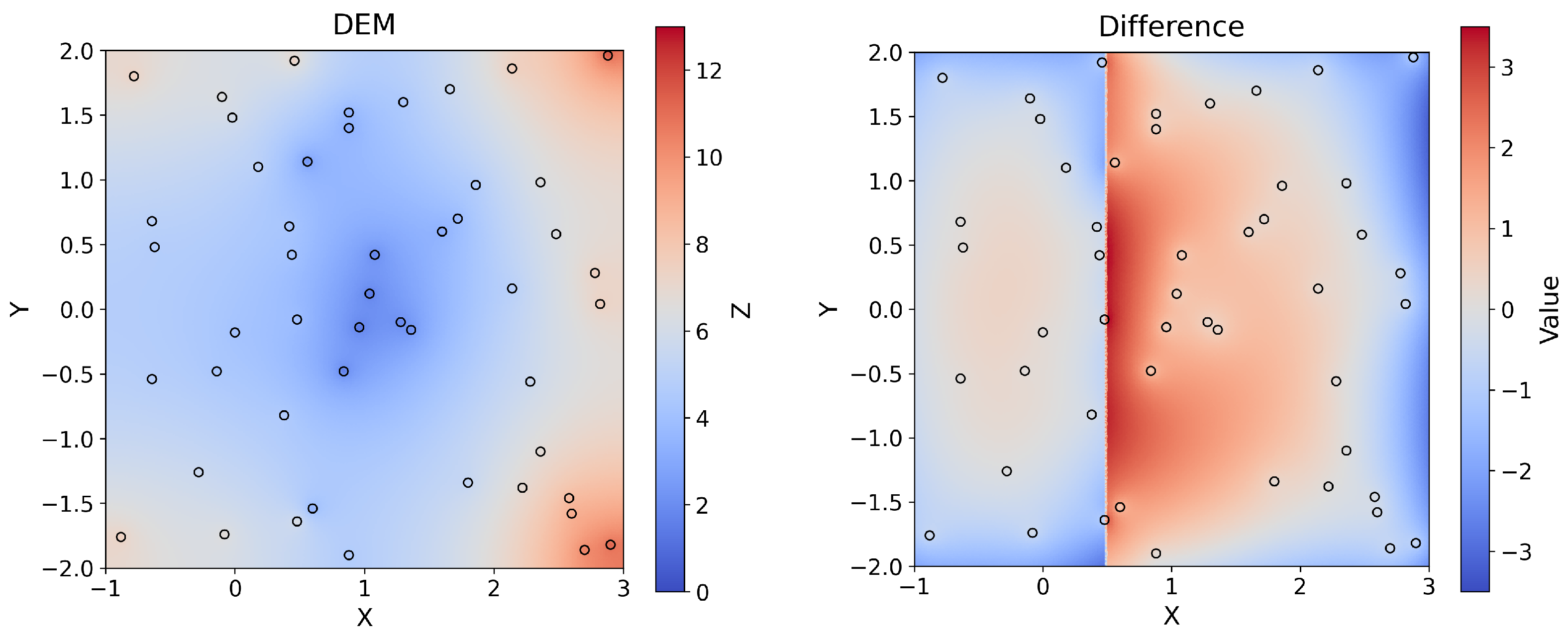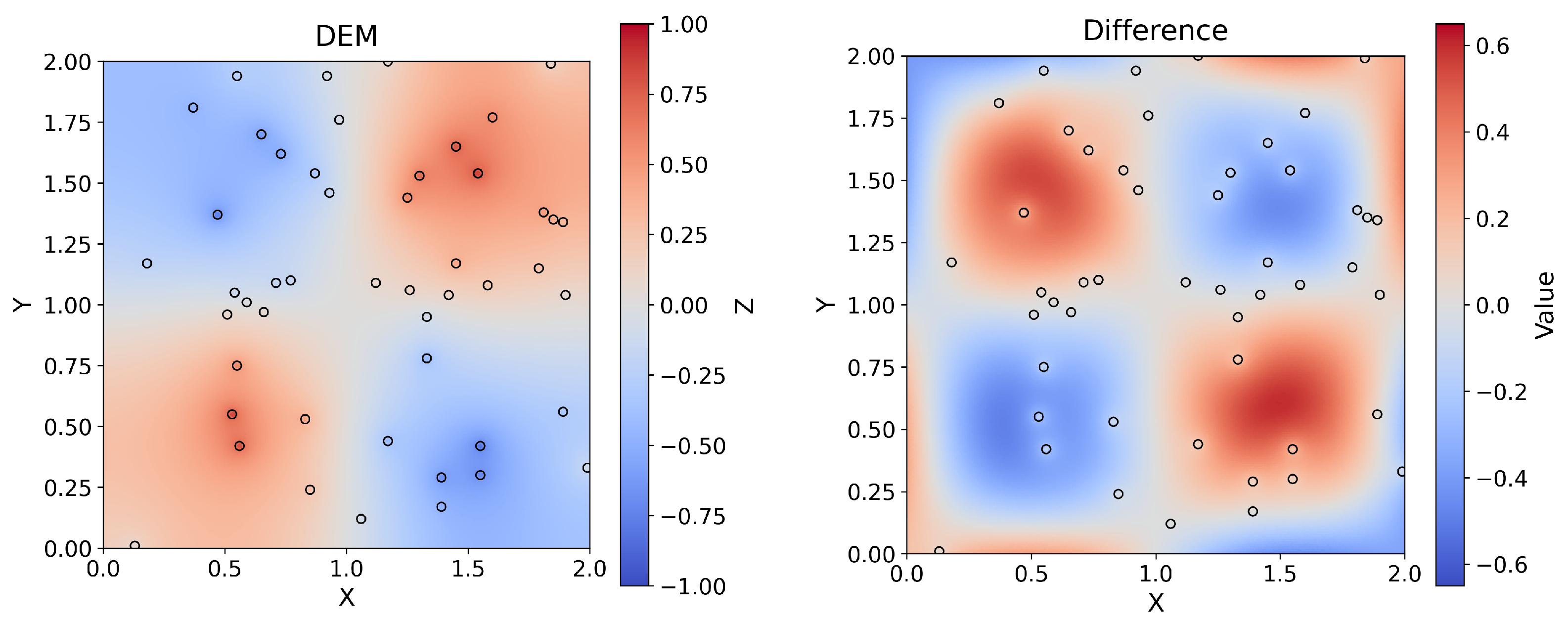 Appendix A. The image on the left illustrates the reconstructed surface obtained with each interpolation method, while the image on the right displays the contour map of the differences with respect to the analytical reference function. These differences constitute interpolation errors with respect to the analytical surface; however, they reflect the intrinsic regularization imposed by the harmonic formulation rather than a numerical deficiency of the method. The objective is not to reproduce the exact pointwise values of the analytical function, but to capture its essential geometric features in terms of elevation and slope continuity.