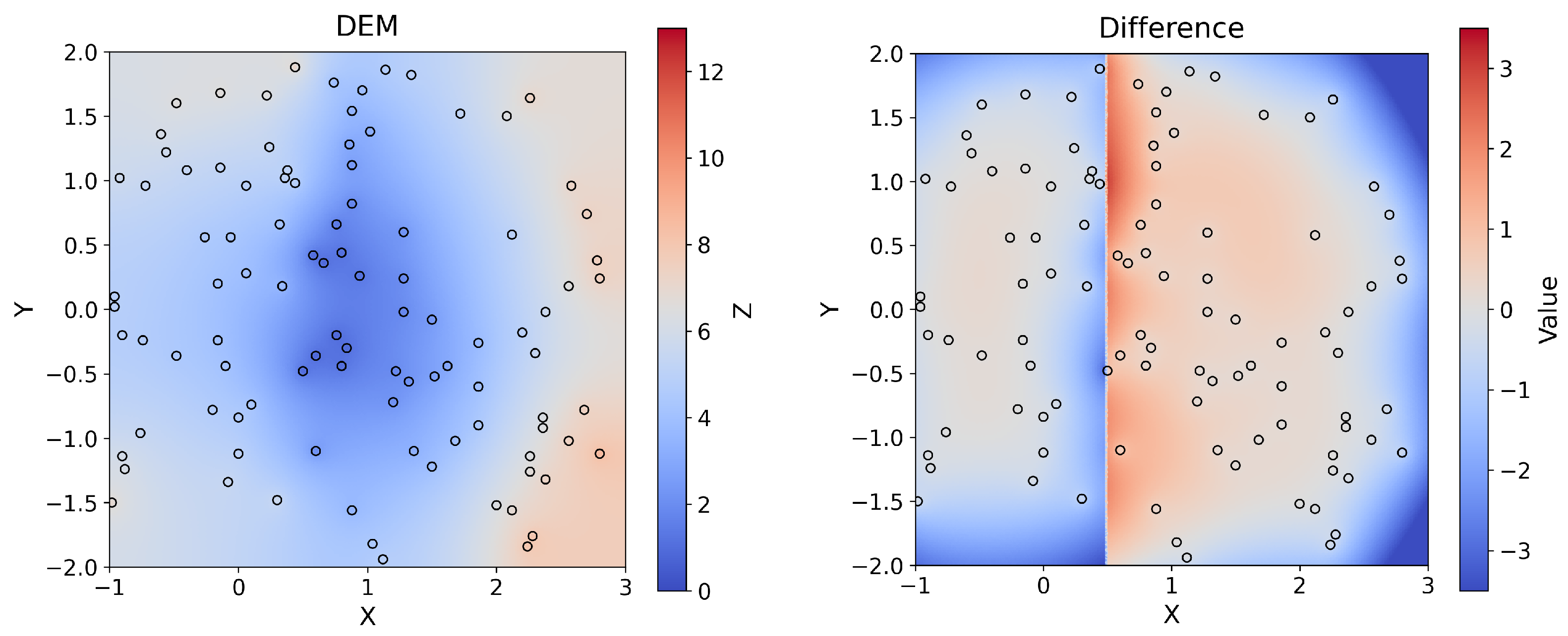 To overcome this limitation, we introduce an auxiliary preprocessing step based on radial basis function (RBF) interpolation. This step is not part of the Poisson-based reconstruction method proposed in this work; it is included solely to provide a consistent and controlled procedure for constructing a NURBS representation in the numerical comparisons. We employ a second-order polyharmonic spline RBF, also known as the logarithmic biharmonic kernel, , which yields a smooth interpolant over the entire domain and remains stable under irregular point distributions. Since the RBF is an exact interpolant, it passes through all available data points and therefore provides a reference surface that reproduces the known elevations with zero interpolation error.