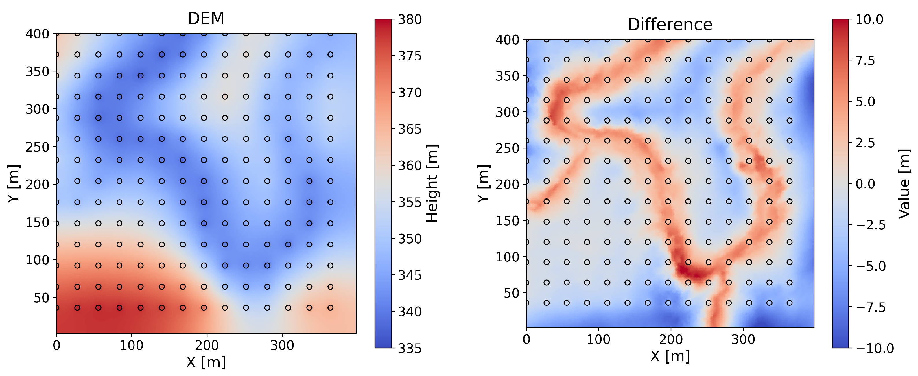 Figure 3, right). These differences should be interpreted as deviations with respect to the reference dataset rather than absolute errors, reflecting how each interpolation approach adapts a smooth surface to the actual topography while preserving slope continuity and overall terrain morphology.