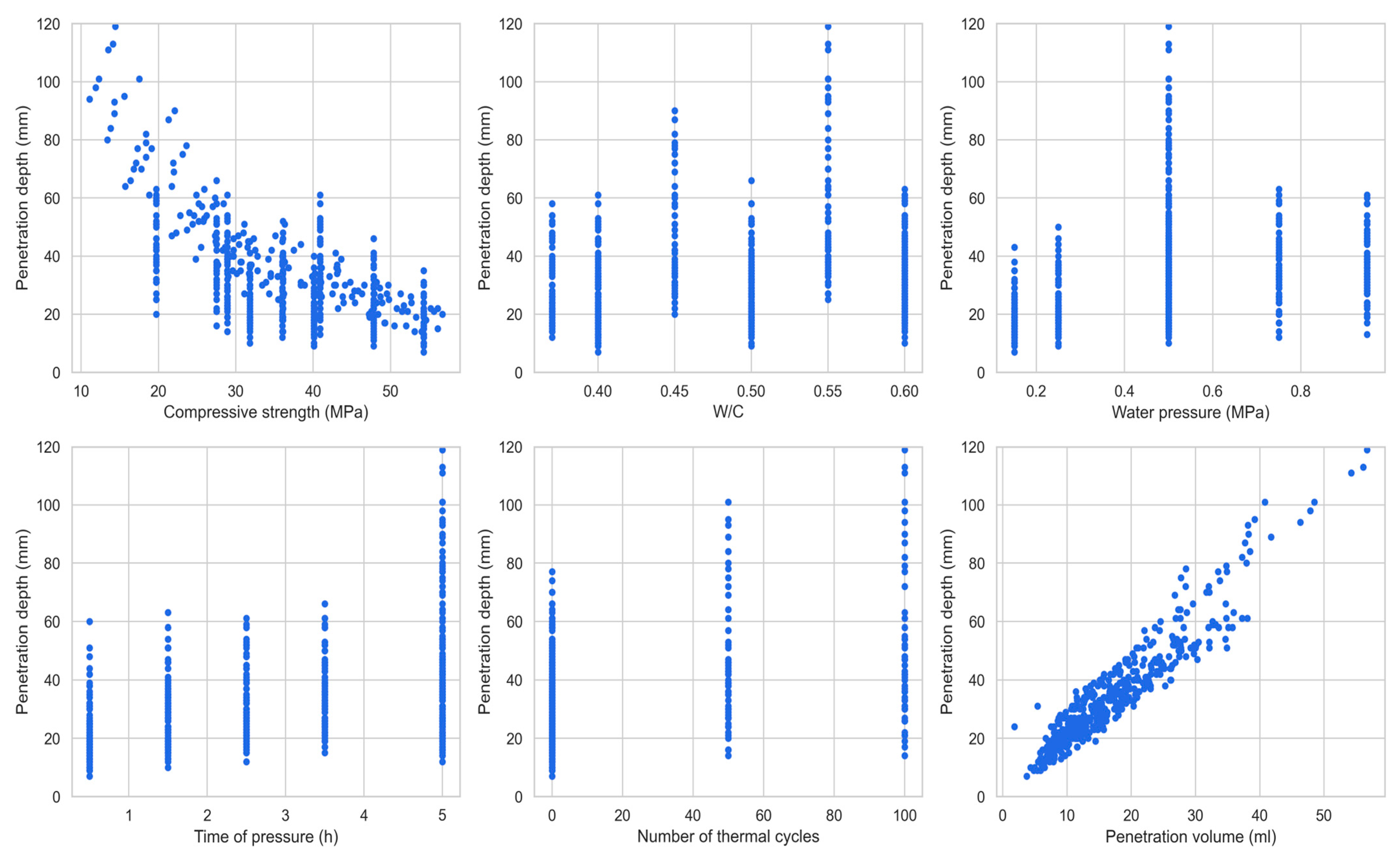 | Structure | Water Penetration Volume (mL) | Compressive Strength (MPa) | W/C | Thermal Cycles | Curing (Day) | Water Pressure (MPa) | Time of Pressure (h) | Predicted Penetration (mm) |