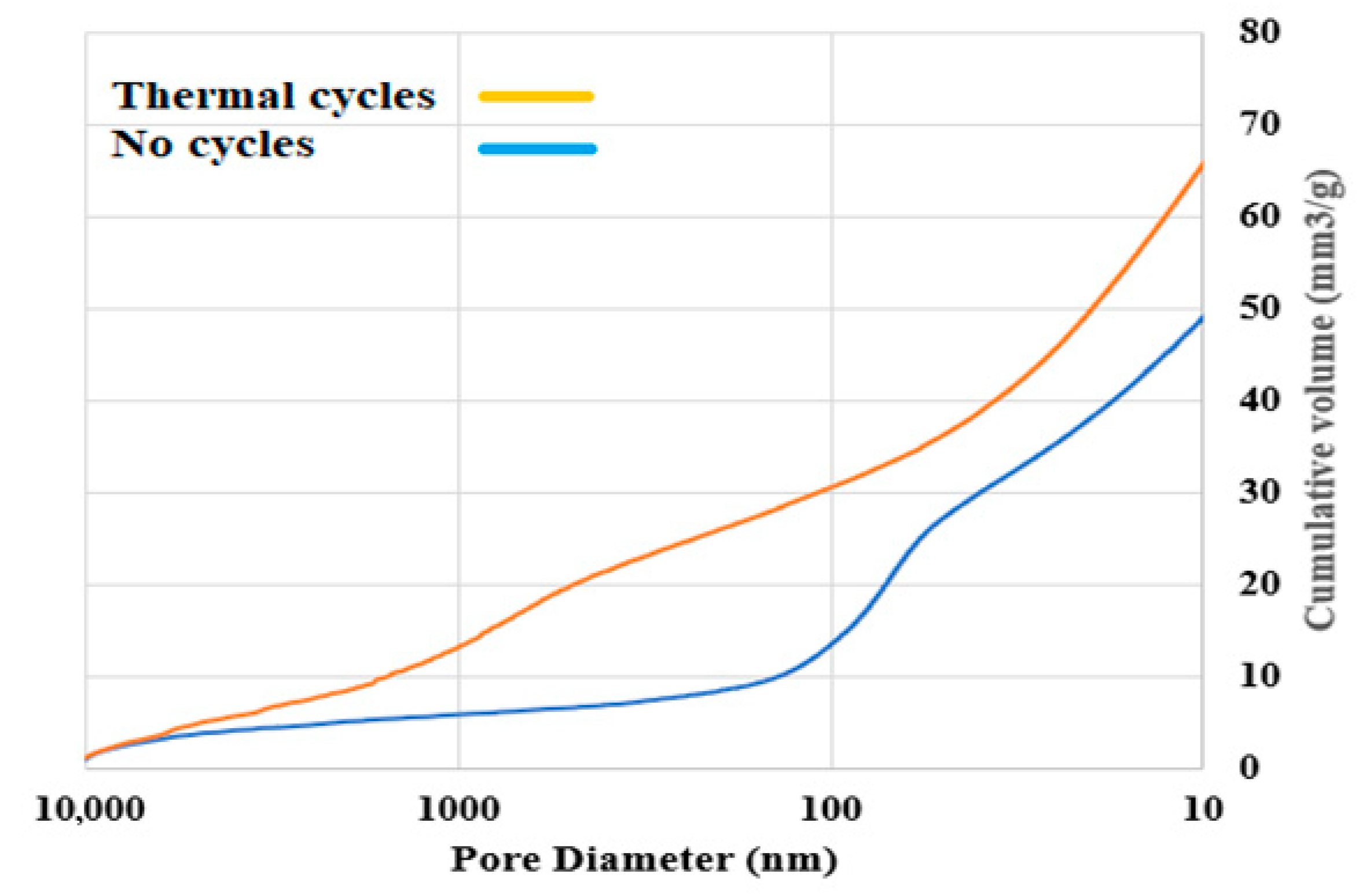 - Thermal cycling substantially increased the cumulative pore volume, primarily in the capillary domain (50–1000 nm), which signifies intensified pore interconnectivity. This process also led to the growth of larger voids (>1 µm) due to progressive microcrack extension. These microstructural alterations, caused by non-uniform thermal fields and expansion mismatches, collectively enhance capillary continuity, elevate permeability, and reduce the material’s resistance to aggressive agents.