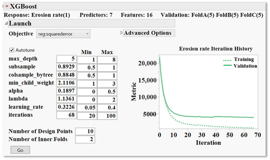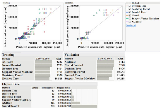 To address this objective, a comprehensive model screening process was conducted using the “Model Screening” platform in JMP Pro 18, which enables simultaneous training, validation, and comparative performance analysis of multiple machine learning algorithms. Six widely used models were examined, including Extreme Gradient Boosting (XGBoost), Artificial Neural Network (ANN), Bootstrap Forest (BF), Boosted Tree (BT), Decision Tree (DT), and Support Vector Machines (SVM). Each model was trained using identical data partitions and assessed using the Root Average Squared Error (RASE) as the key performance metric. To initiate the screening process, the erosion rate was selected as a response variable or target, and all other variables (material type, hardness, particle size, fluid type, impact angle, impact velocity, and sand content) were selected as predictive variables or features. The dataset was split as 75% for model training and 25% for model validation. This screening phase served as a foundational step in determining the most effective modelling approach for accurately predicting erosion behaviour [35].