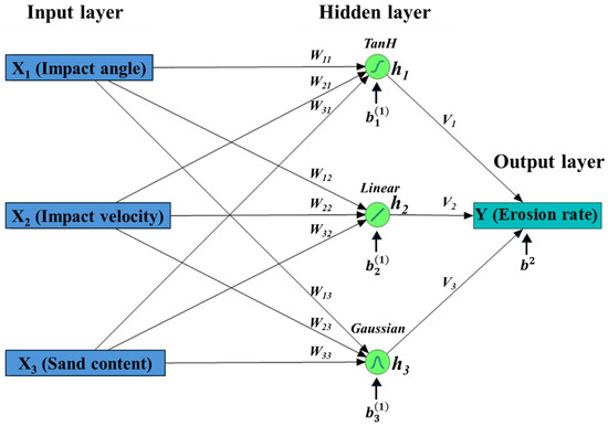 - An input layer comprising three variables: impact angle (X1), impact velocity (X2), and sand content (X3).