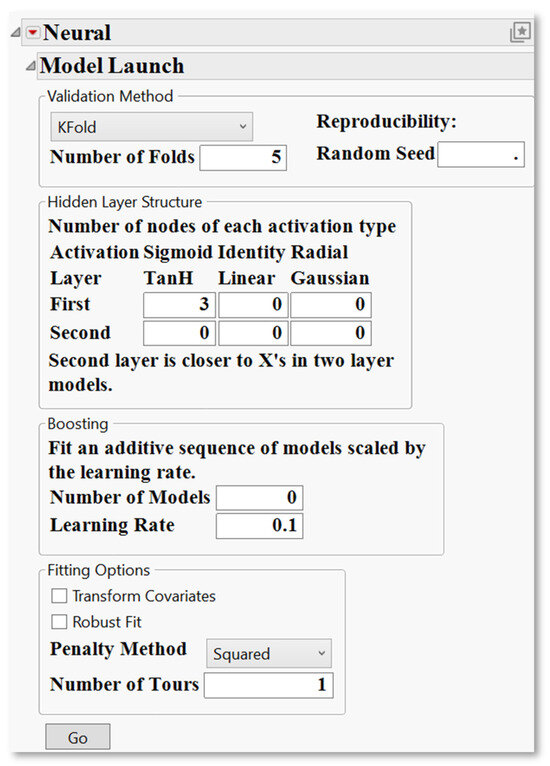 The activation functions are a critical component of the ANN, introducing the non-linearity needed for the network to learn complex patterns and approximate the predicted non-linear functions. The output from each neuron is passed through an activation function before being transmitted to the next layer. Without activation functions, the entire network would reduce to a simple linear transformation [39]. JMP Pro supports up to two hidden layers and allows any combination of three available activation functions, offering flexibility for a wide range of non-linear transformations to suit different modelling contexts. The mathematical expressions of these functions are presented in Table 2.
