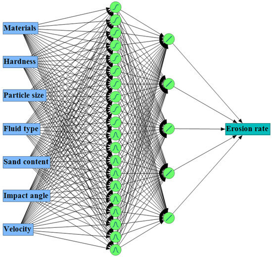 To illustrate the fundamental computational mechanism of the ANN in predicting erosion rate, this section presents a simplified example of the forward propagation process. While the actual architecture implemented in this study involves a larger number of variables and potentially deeper hidden layers, the following formulation captures the essential logic underlying the machine learning process. The network propagates input information through weighted connections, applies bias terms, and transforms the resulting values using activation functions.