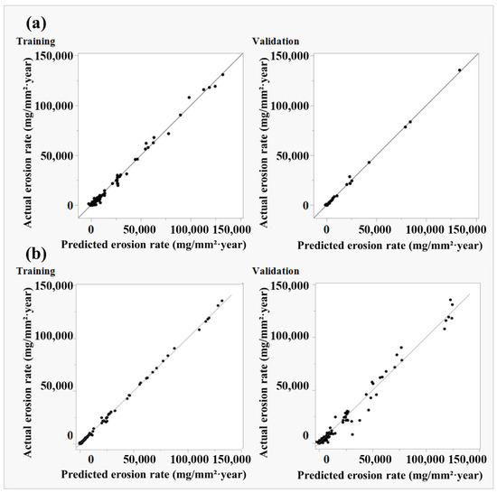 Actual vs. predicted erosion rates for both training and validation phases: (a) ANN and (b) XGBoost.