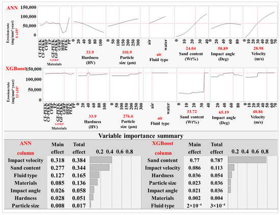 To better understand the performance of the developed models in representing the individual and combined effects of input variables on the predicted erosion rate, a prediction profiler analysis was generated using the trained ANN and XGBoost models. This tool provides a visual and interpretable representation of the model’s predicted response to a controlled change in each input factor while holding others constant. This analysis enables a critical evaluation of the model’s internal structure and learned variable interactions for physical interpretability by allowing for an interactive examination and comparison of predicted trends with established physical behaviours observed in the erosion literature, thereby validating the model’s physical credibility. The upper part of Figure 13 illustrates the effect of the seven predictors on the erosion rate using both ANN and XGBoost models. The vertical red dashed lines represent the selected scenario values, while the black trend lines depict the model’s predicted response across each variable’s range.