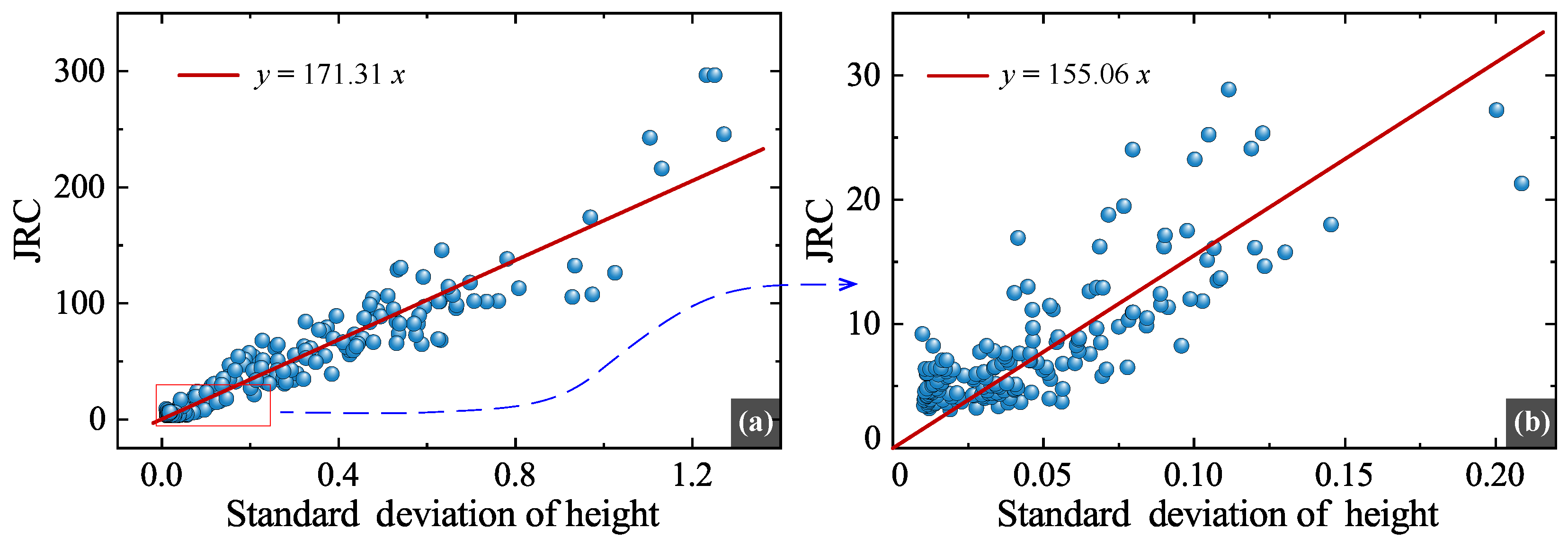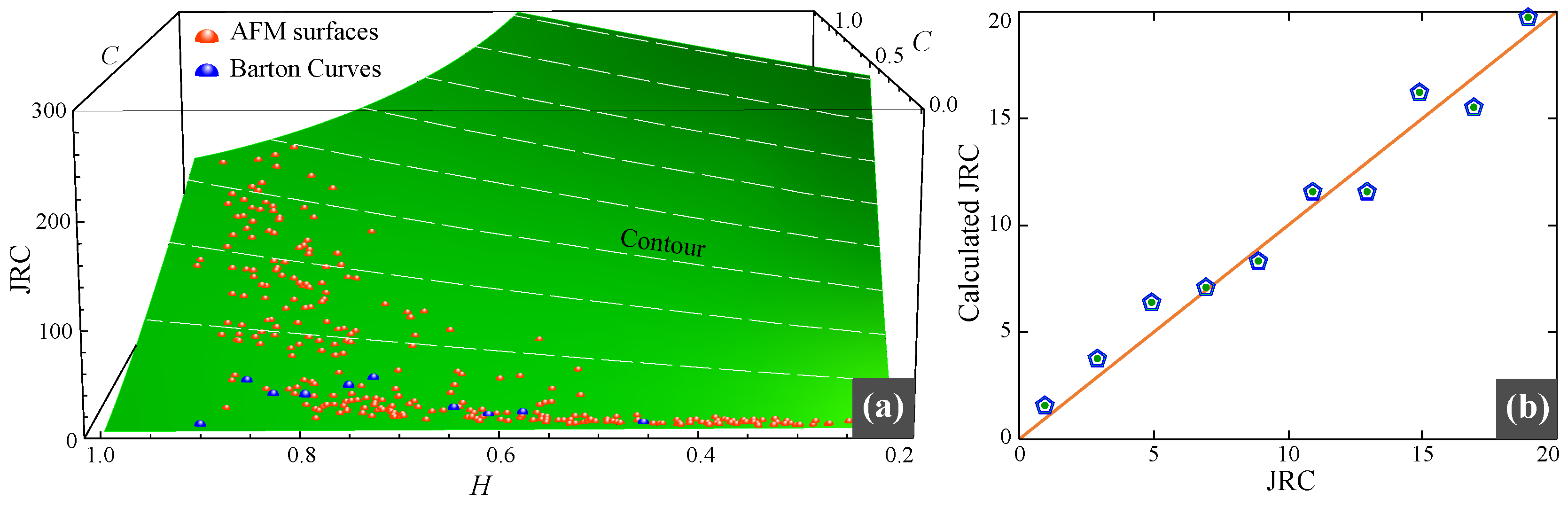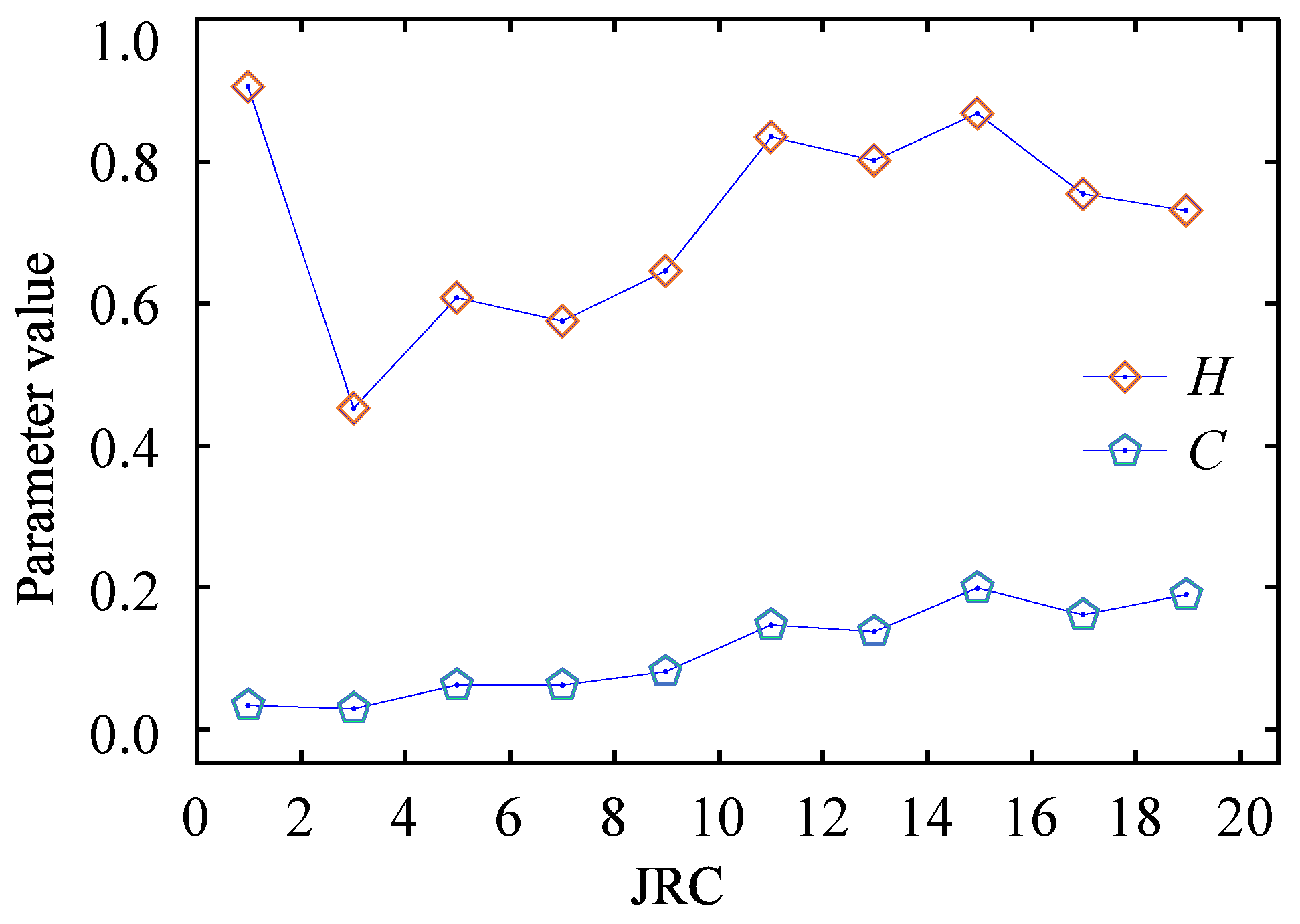 - As an empirical parameter comprehensively reflecting the roughness of a joint surface, JRC incorporates both scale information and undulation characteristics. This study suggests that the combined effect of both parameter C (reflecting height information) and H (reflecting frequency information) should be considered to fully characterize the rough features of structural surfaces.