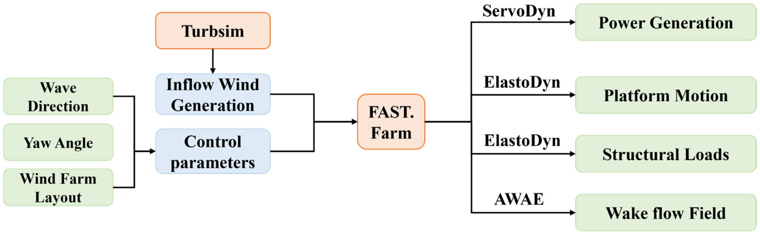 Figure 1. First, a numerical wind field is generated using Turbsim (v2.00.07a-bjj). Then, the offshore wind farm model under investigation is established within FAST.Farm by inputting various combinations of wave incident angles and the yaw angles of the first column of wind turbines, along with the wind farm layout configuration. The main driver program of FAST.Farm calls submodules from OpenFAST to simulate individual wind turbines. The AeroDyn module calculates the aerodynamic loads on the rotor based on the displacement and velocity of the blade elements’ motion. The HydroDyn module computes the hydrodynamic loads based on the displacement and velocity components of the floating structure. The ServoDyn module provides control commands based on the current structural accelerations and reaction force, finally calculating the generator’s electrical power output. The ElastoDyn module primarily computes the overall structural motions, including displacements, velocities, and accelerations, and calculates the structural loads based on the aerodynamic loads, hydrodynamic loads, and control commands provided by the previous three modules.