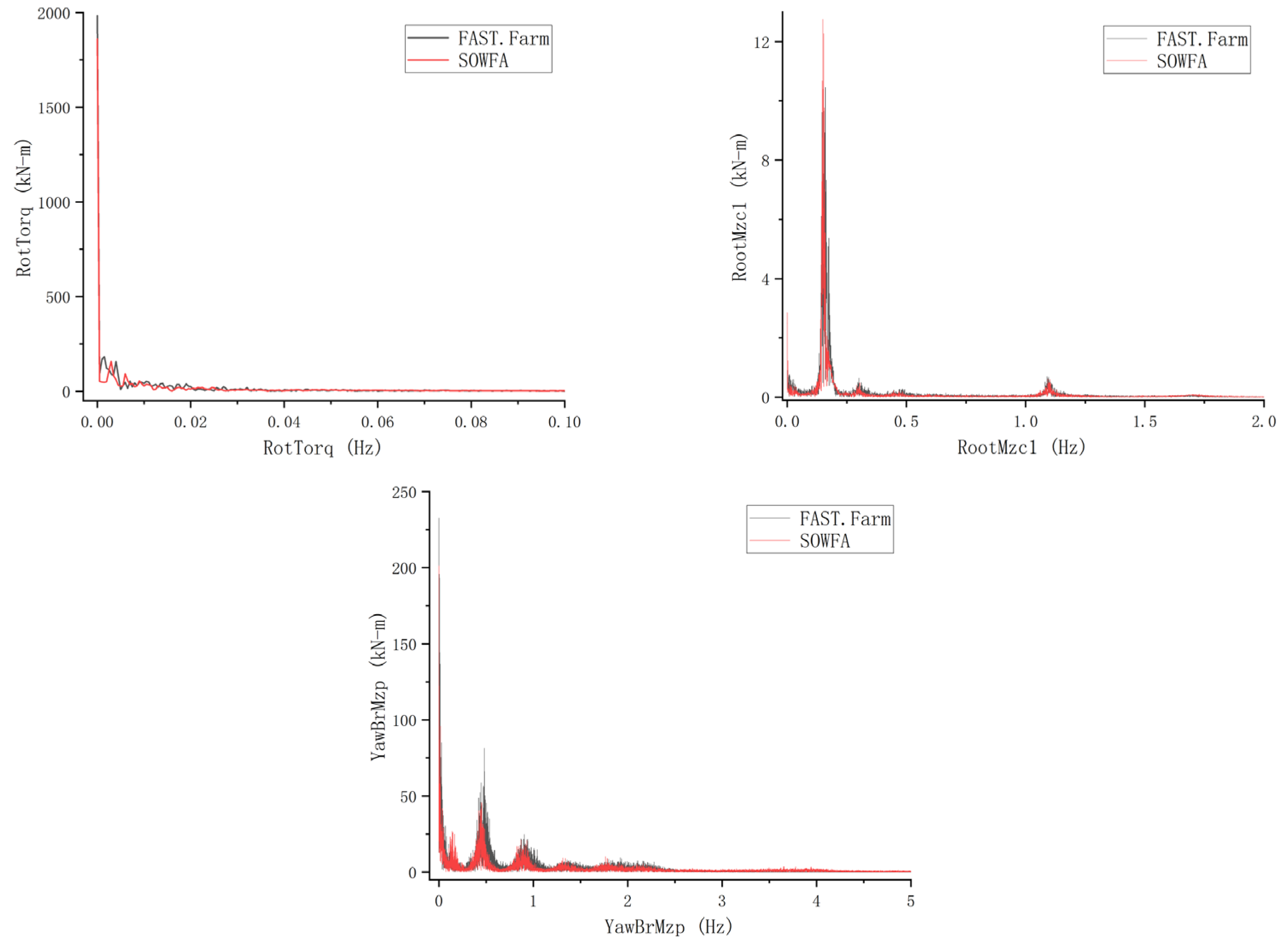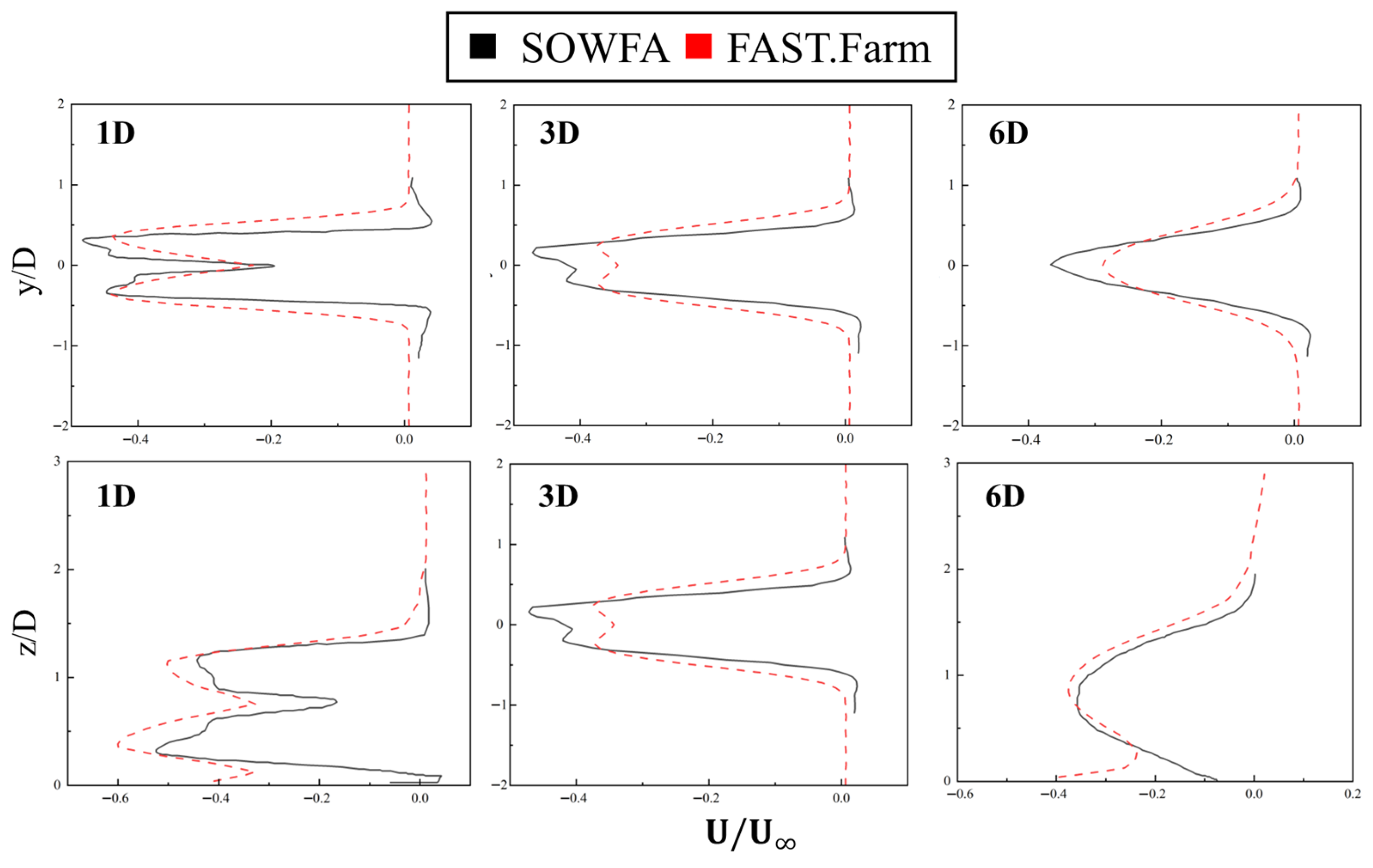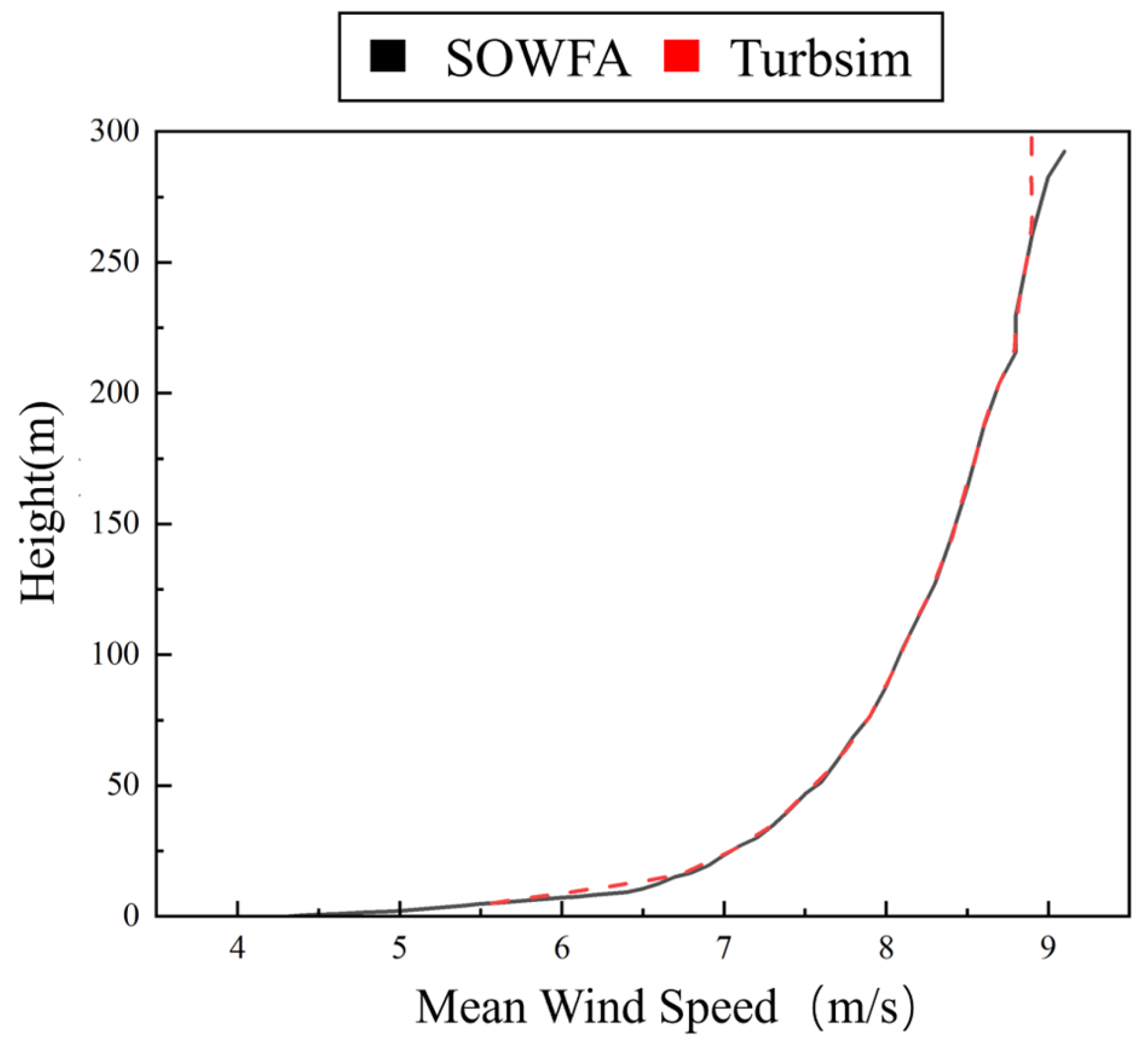 ). For high-fidelity validation, the wake effects of a wind turbine under atmospheric boundary layer (ABL) inflow are modeled by coupling OpenFAST into SOWFA for FOWT simulations. In contrast, the turbulent inflow in FAST.Farm was generated using TurbSim, based on the Kaimal spectrum and the Normal Turbulence Model as specified in the IEC standard. For the comparison of undisturbed wind speed profiles, the result computed by FAST.Farm shows good agreement with that validated by SOWFA, please refer to