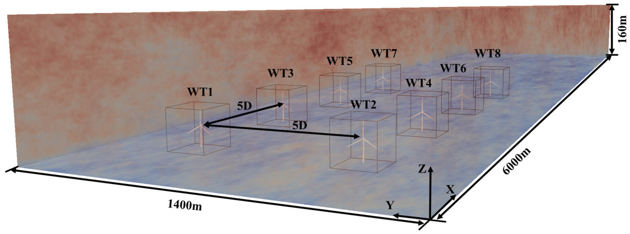32]. In their work, Carmo et al. generated the background wind field by simulating the precursor atmospheric boundary layer via SOWFA, which featured an 8 m/s mean wind speed at the hub height. Additionally, the surface roughness height (