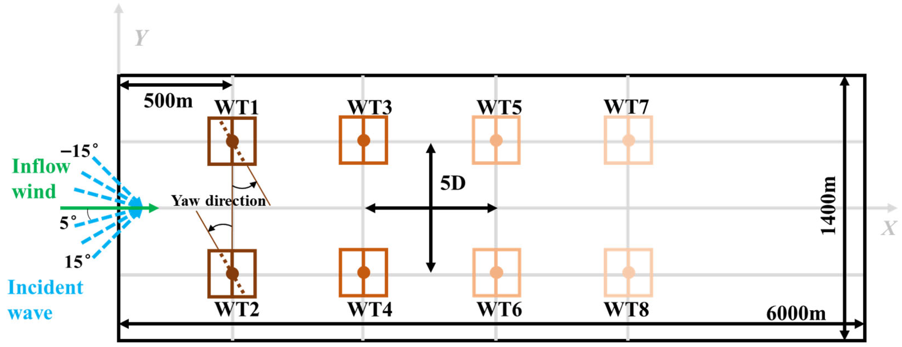 21] studied the aerodynamic loads and platform motion of a floating wind turbine under dynamic yaw conditions based on a free vortex wake method. They found that there is a positive correlation between the oscillation amplitude of aerodynamic loads and the active yaw frequency. Furthermore, how dynamic yaw influences platform motion can be simplified into additional hydrostatic stiffness and damping. In practice, both wind-wave misalignment and yaw control are factors that need to be considered simultaneously during the operation of FOWTs in the marine environment. However, the aforementioned research often treats wind-wave misalignment and yaw control as independent factors, neglecting their interaction. Furthermore, existing studies are primarily limited to single FOWT, and research on arrays of FOWTs requires further in-depth investigation.