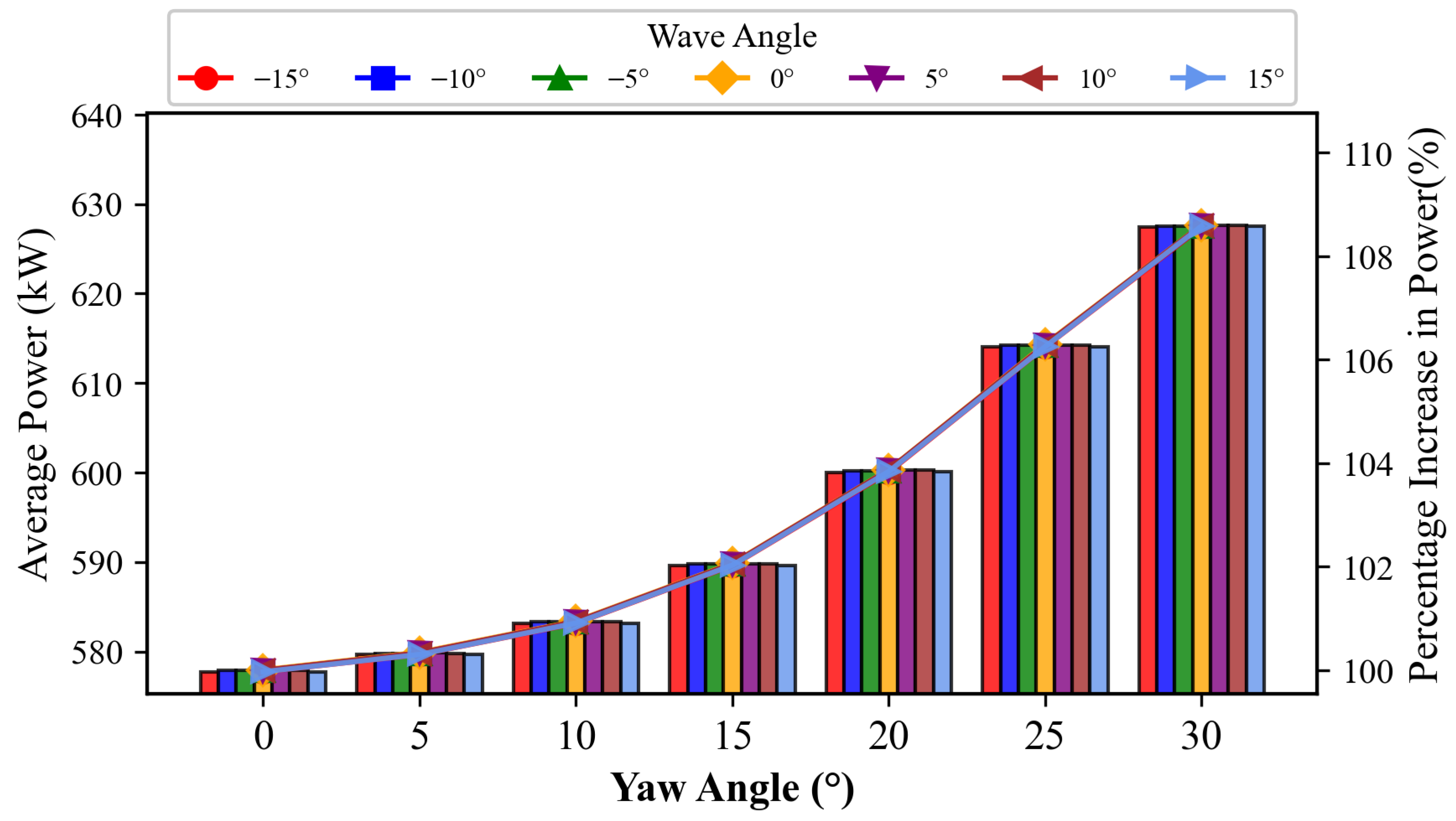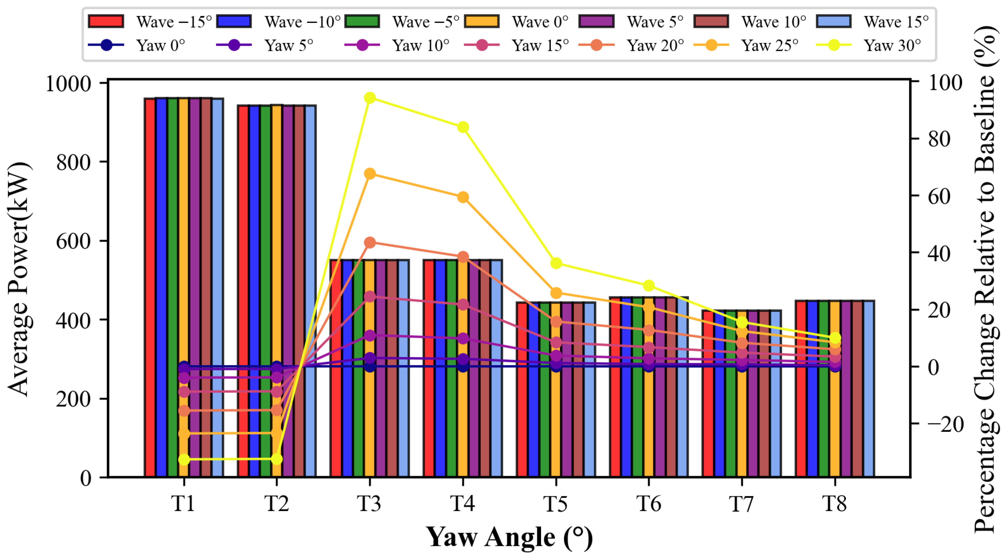 Figure 8 presents bar charts of the average power for each turbine under different cases, along with the corresponding percentage difference curves. It is important to note that these bar charts reflect the average power generation across all yaw cases for a given wave incident angle, while the line graph represents the percentage difference between the average power of the current turbine under the current yaw case (averaged across all wave incident angles) and its average power under the baseline case.