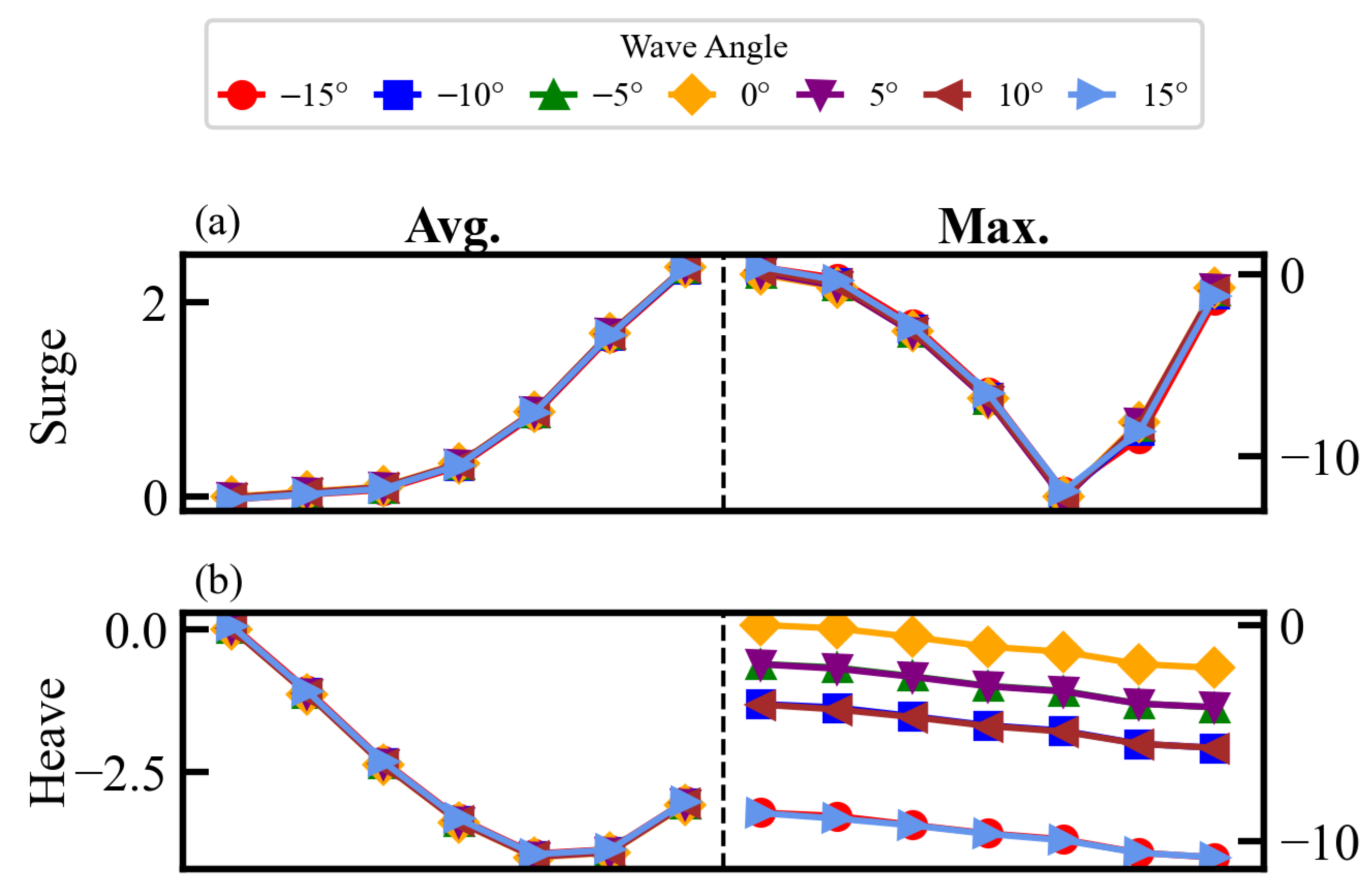 Figure 9a, it is evident that the increase in surge motion for the downstream three turbines outweighs the decrease for the first column turbine, resulting in an overall positive correlation between the average surge motion of the entire farm and the yaw angle. Meanwhile, the trend in the maximum surge motion of the upstream turbine generally aligns with that of its average value. For the downstream turbines, however, the influence of the first column turbine’s yaw control on their platform motions diminishes with increasing streamwise distance. At this point, the effect of the wave incident angle becomes more apparent, though its impact magnitude is only about 2%.