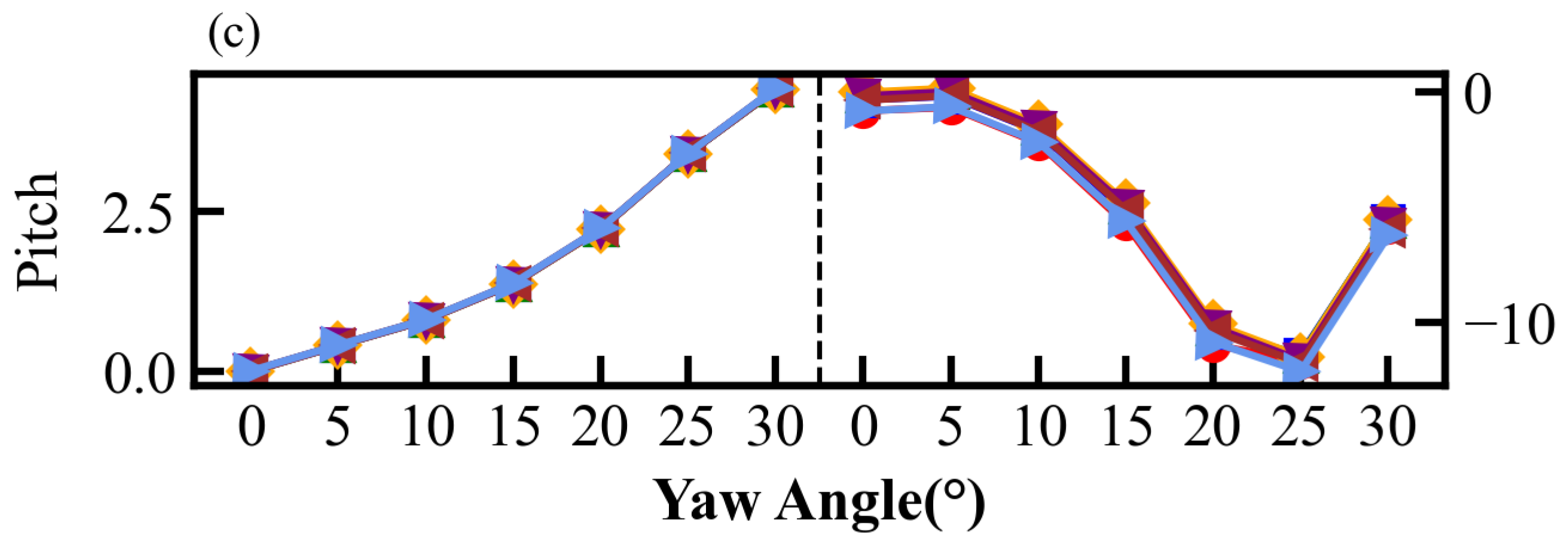 Figure 9c, it can be observed that the average pitch motion of the platform increases with the yaw angle, but the magnitude of change is significantly greater compared to the surge motion, with an increase of up to approximately 4%. Additionally, it can be noted that the variation pattern of pitch motion is similar to that of surge motion, and the wave incident angle has a relatively minor influence on the platform motion in these two directions. However, the extreme value of the maximum pitch motion occurs at a larger yaw angle, indicating that the maximum pitch motion responds more slowly to changes in the yaw angle.
