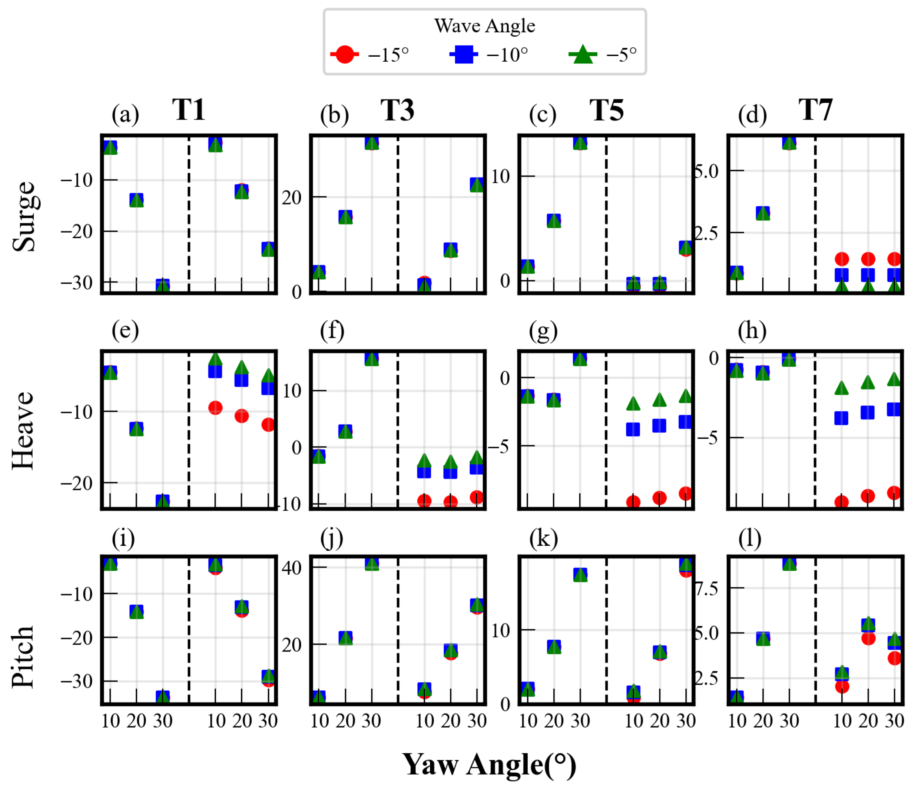 To further investigate the motion patterns of individual wind turbines in the wind farm under different operating conditions, four turbines on the upper side—T1, T3, T5, and T7 were selected for analysis. Since this study only considers scenarios where the first column wind turbines yaw counterclockwise, yaw angles of 10°, 20°, and 30°, along with wave incident angles of −5°, −10°, and −20°, were chosen as the cases with the most significant angular differences.