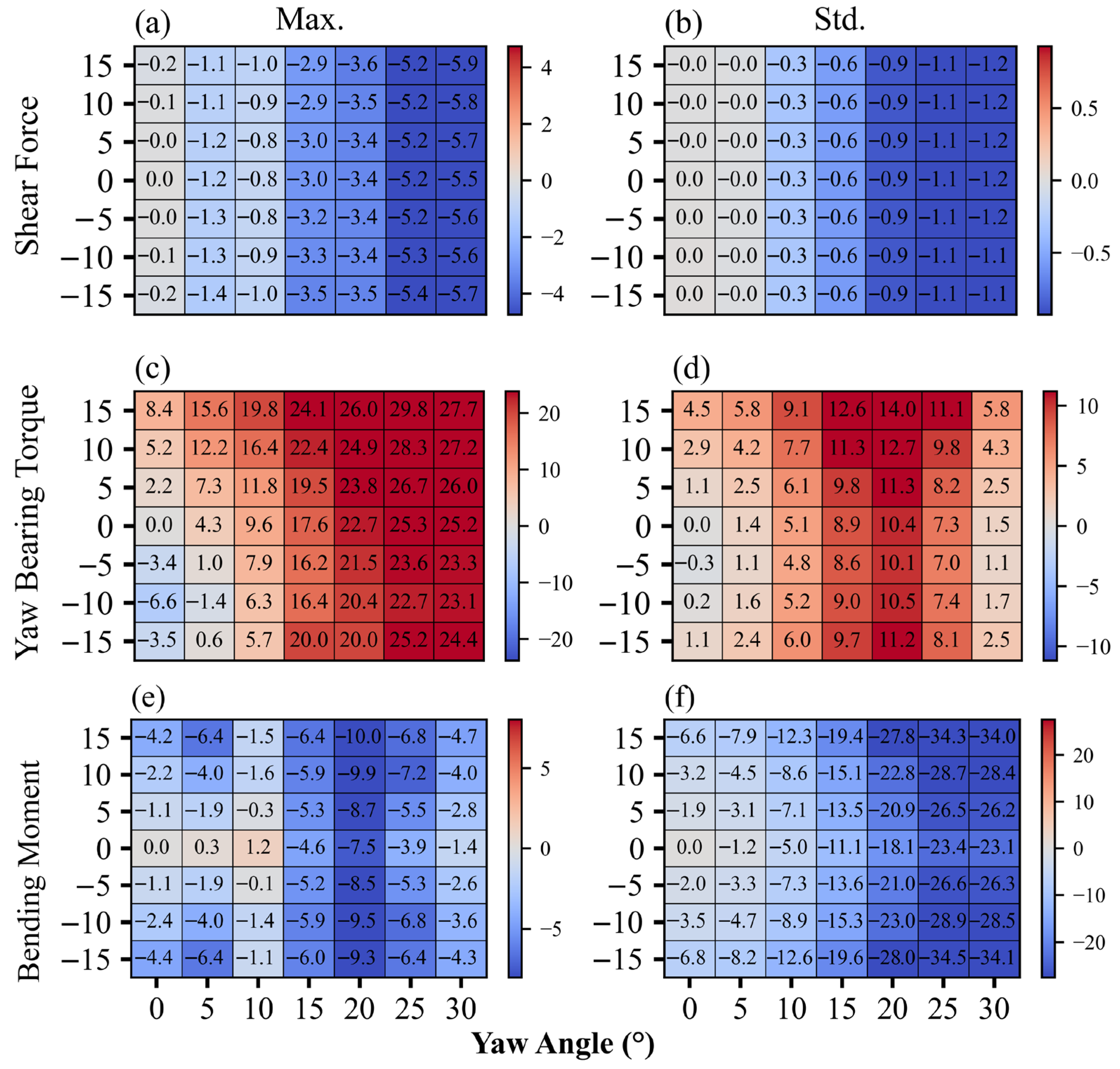 Under wind-wave misalignment conditions, the tower top yaw bearing torque is most significantly affected by the wind-wave misalignment angle. The misalignment causes the lateral components of the wind load and wave load to superimpose, generating a substantial vertical axis torque that is transmitted to the tower top yaw bearing. For the same yaw angle, the torque can increase by up to 10% due to changes in the wind-wave misalignment angle. The variation in the tower base Y-direction bending moment is the next most significant, with a maximum change of approximately 7%. The blade root axial shear force is minimally affected by the wind-wave misalignment angle, and its impact is essentially negligible. Therefore, in practical engineering, when analyzing the loads of FOWTs, wind-wave misalignment is a factor that cannot be neglected due to the superposition effects of wave and wind loads.