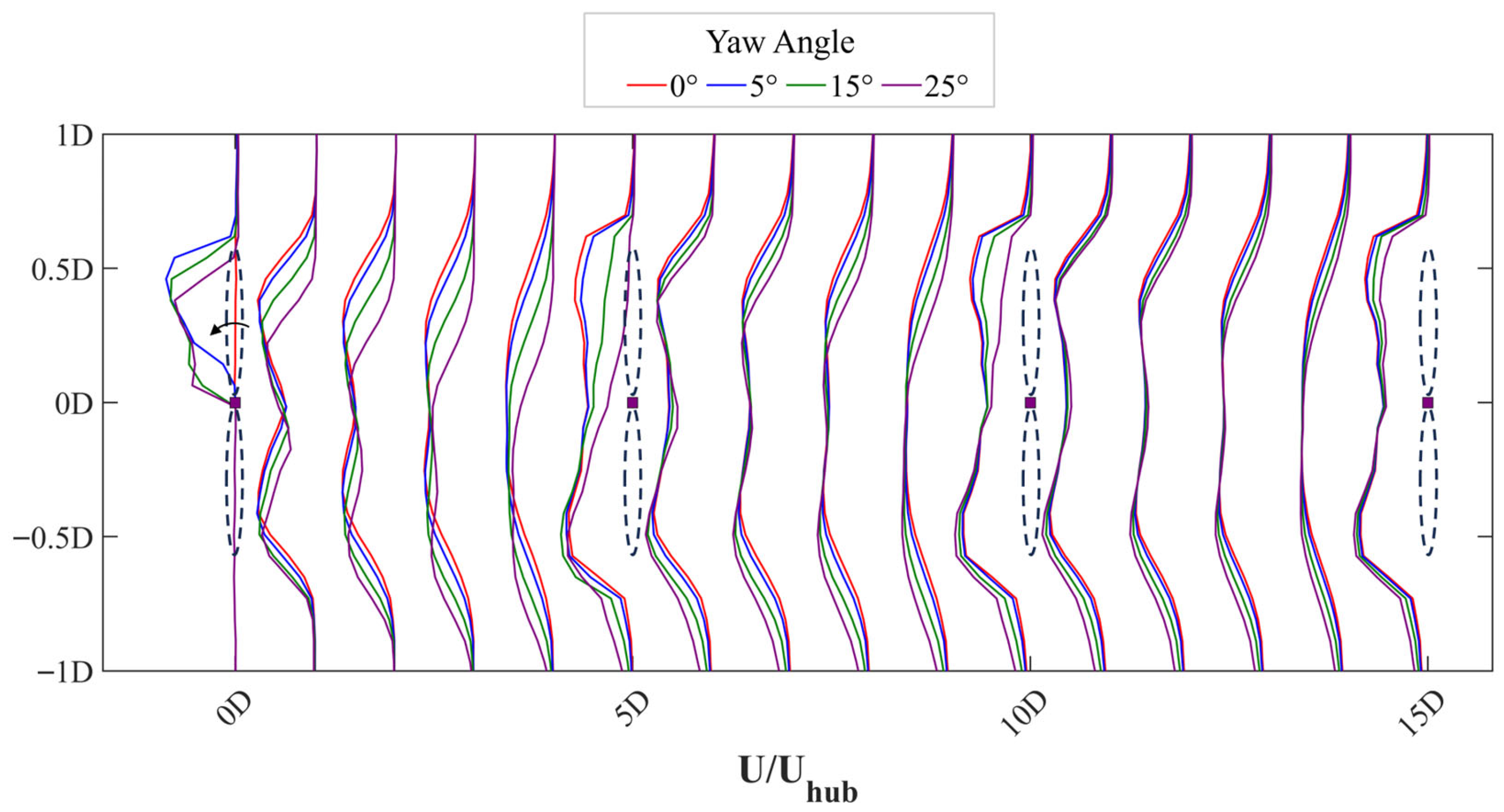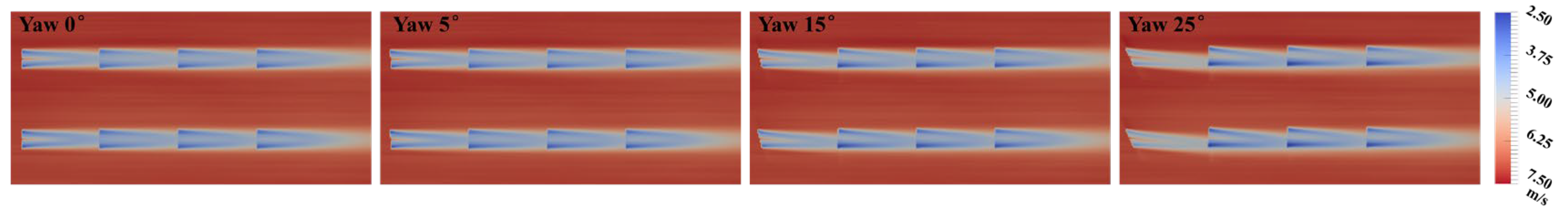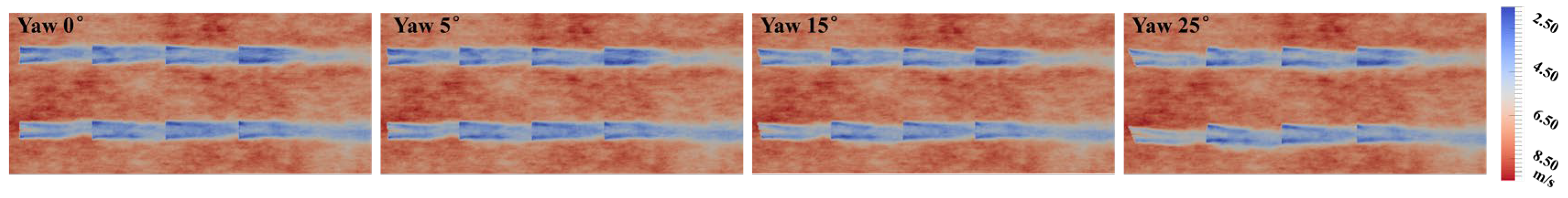 Figure 14 presents the instantaneous velocity contours at the wind turbine hub height plane under a wave incident angle of 10°. The four charts from left to right represent yaw angles of 0°, 5°, 15°, and 25°, respectively.