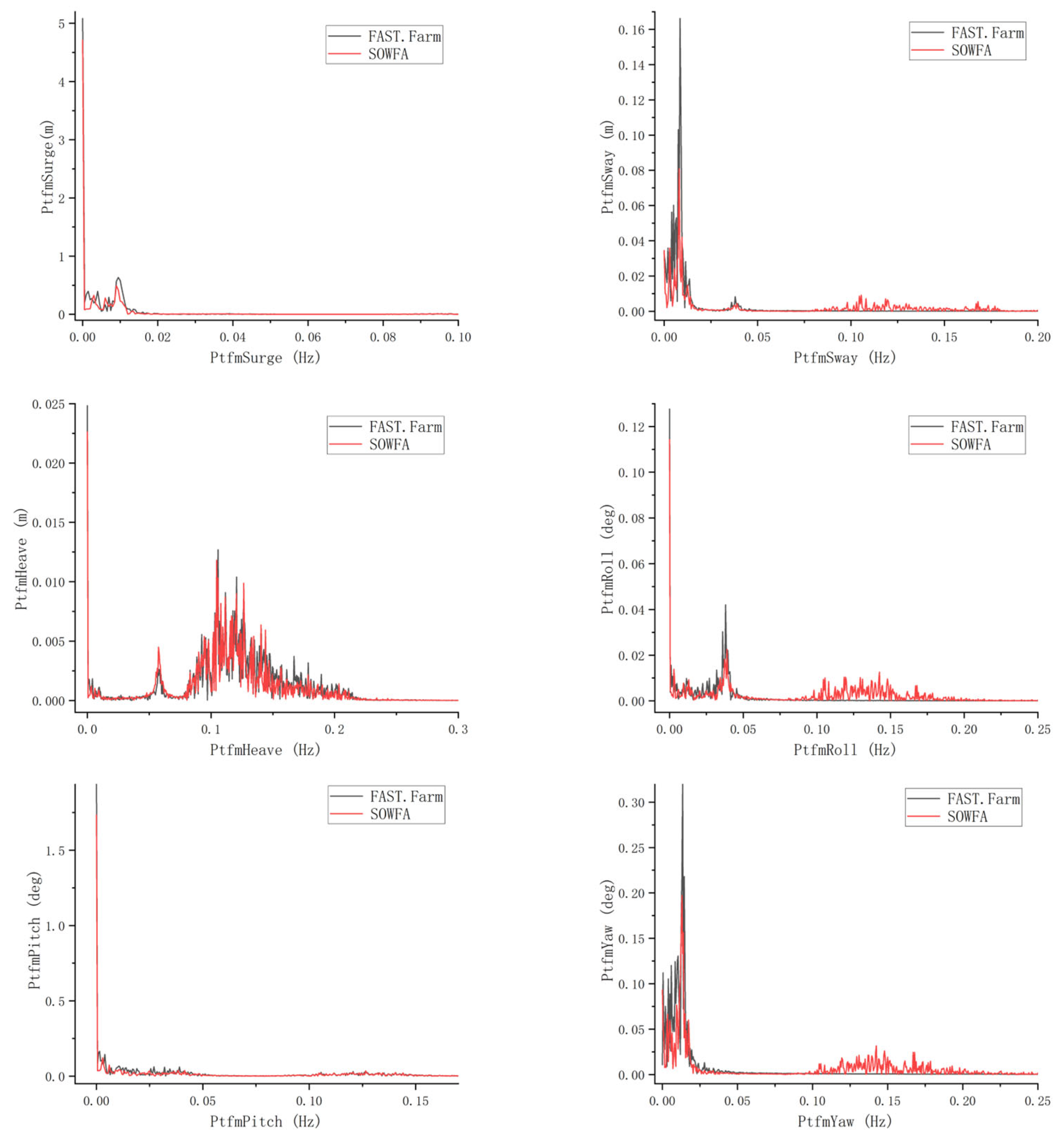 Figure 4, the platform motions exhibit good agreement, confirming the accuracy of the numerical simulation method. The spectral comparison of platform motion and structural loads also shows good agreement, as detailed in