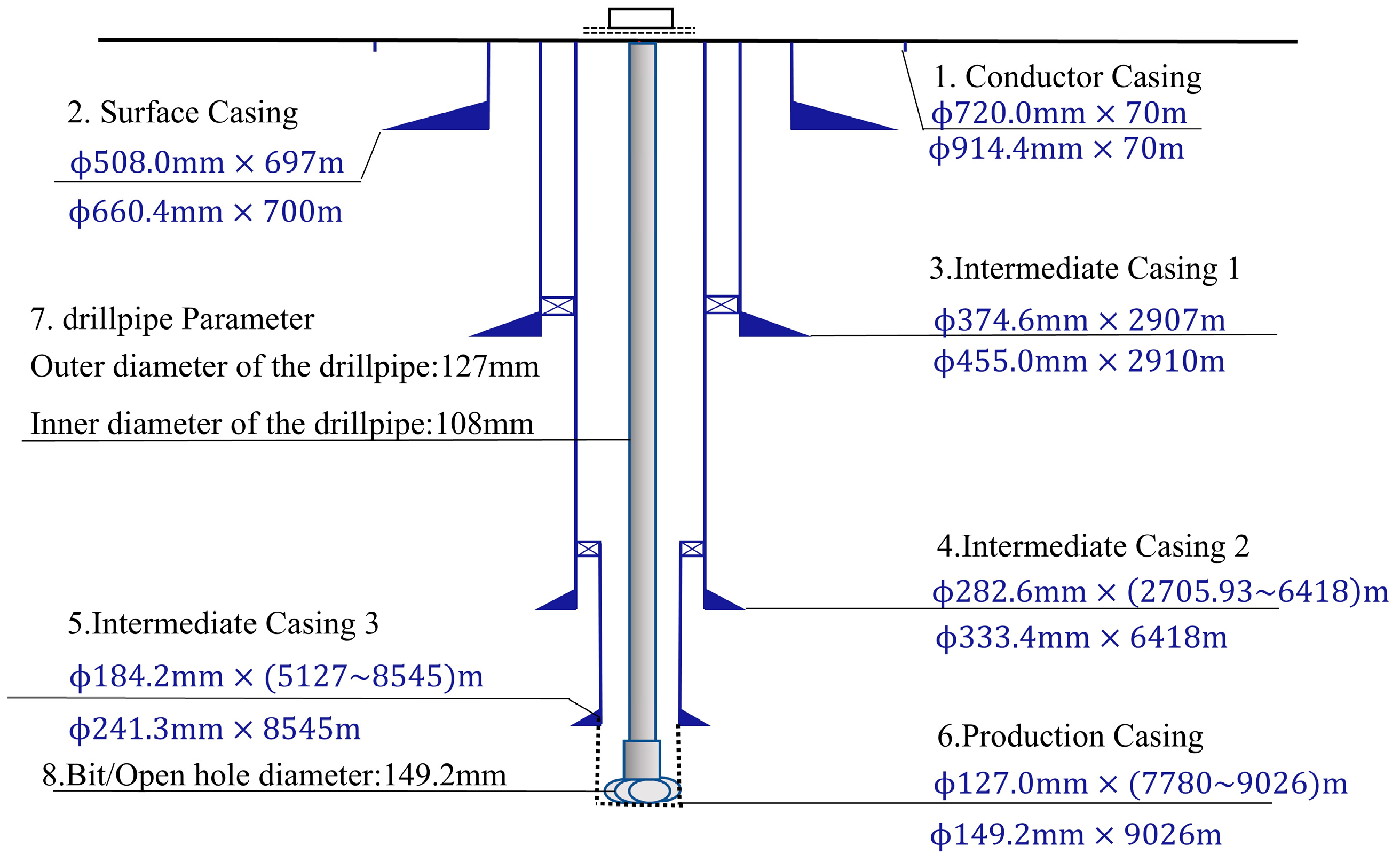- Data collection: The wellbore structure parameters of Well PS6 (an ultra-deep well in the Sichuan Basin) are obtained [34], while the material thermophysical properties and drilling operation parameters are selected from the on-site design schemes of similar wells;