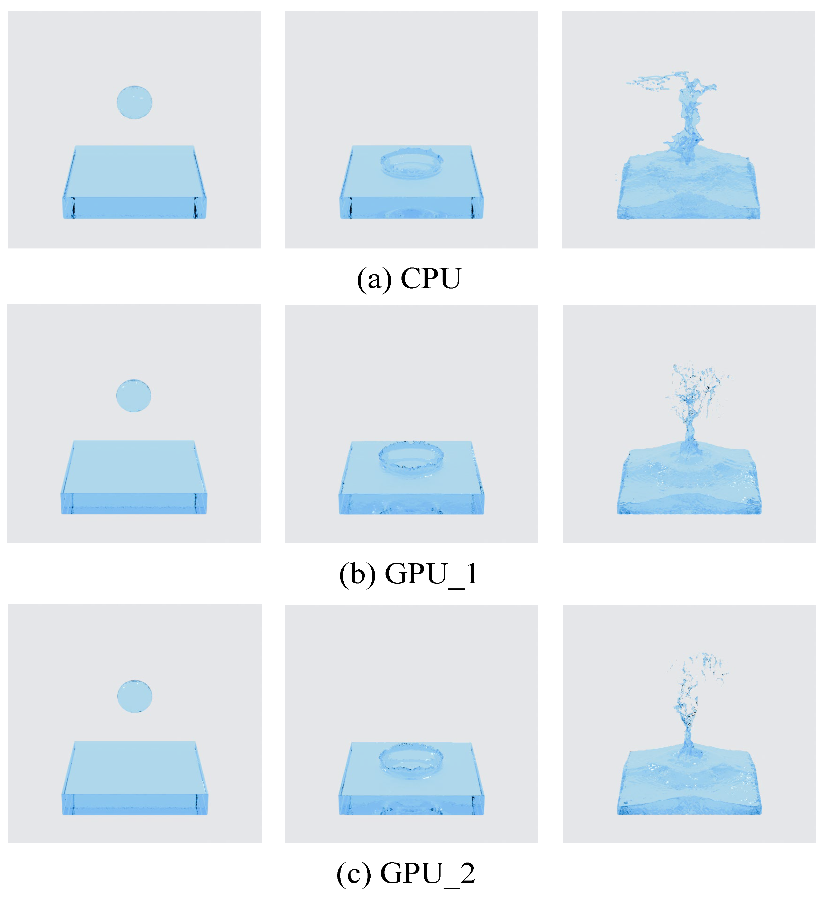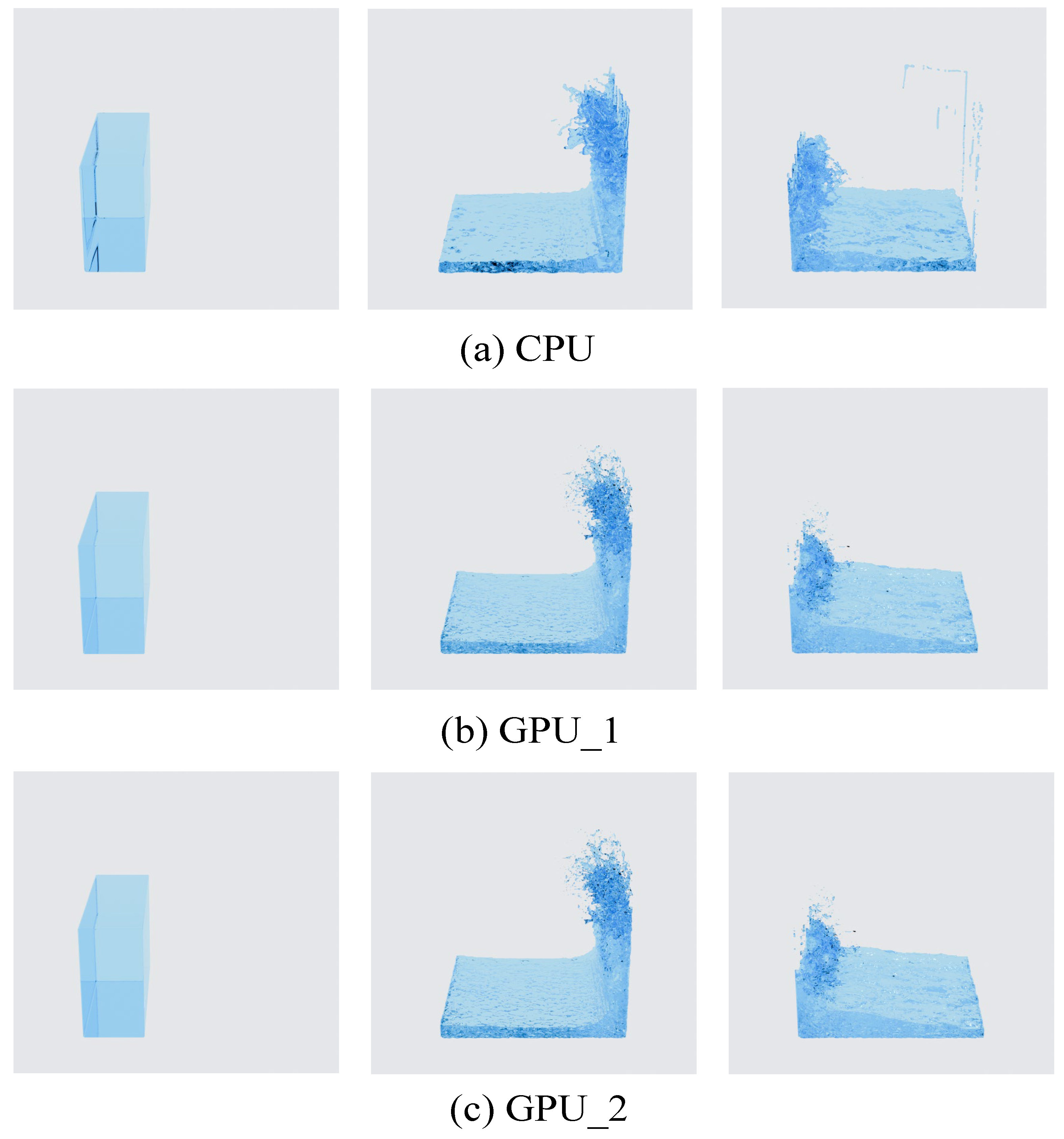 - Guan, Y.M.; Yang, C.H.; Kang, Z.; Zhou, L. Application of an improved GPU acceleration strategy in smoothed particle hydrodynamics. J. Shanghai Jiao Tong Univ. 2023, 57, 981–987. (In Chinese) [Google Scholar]