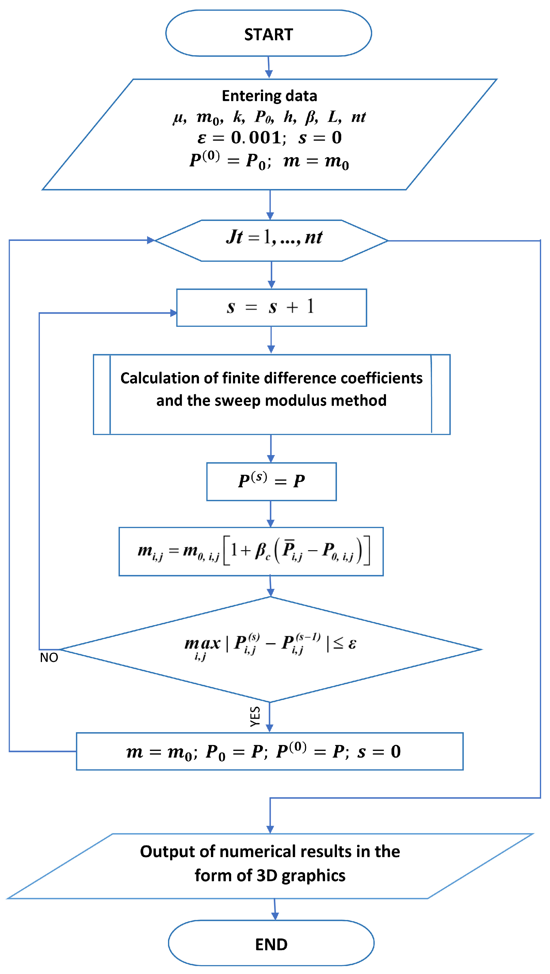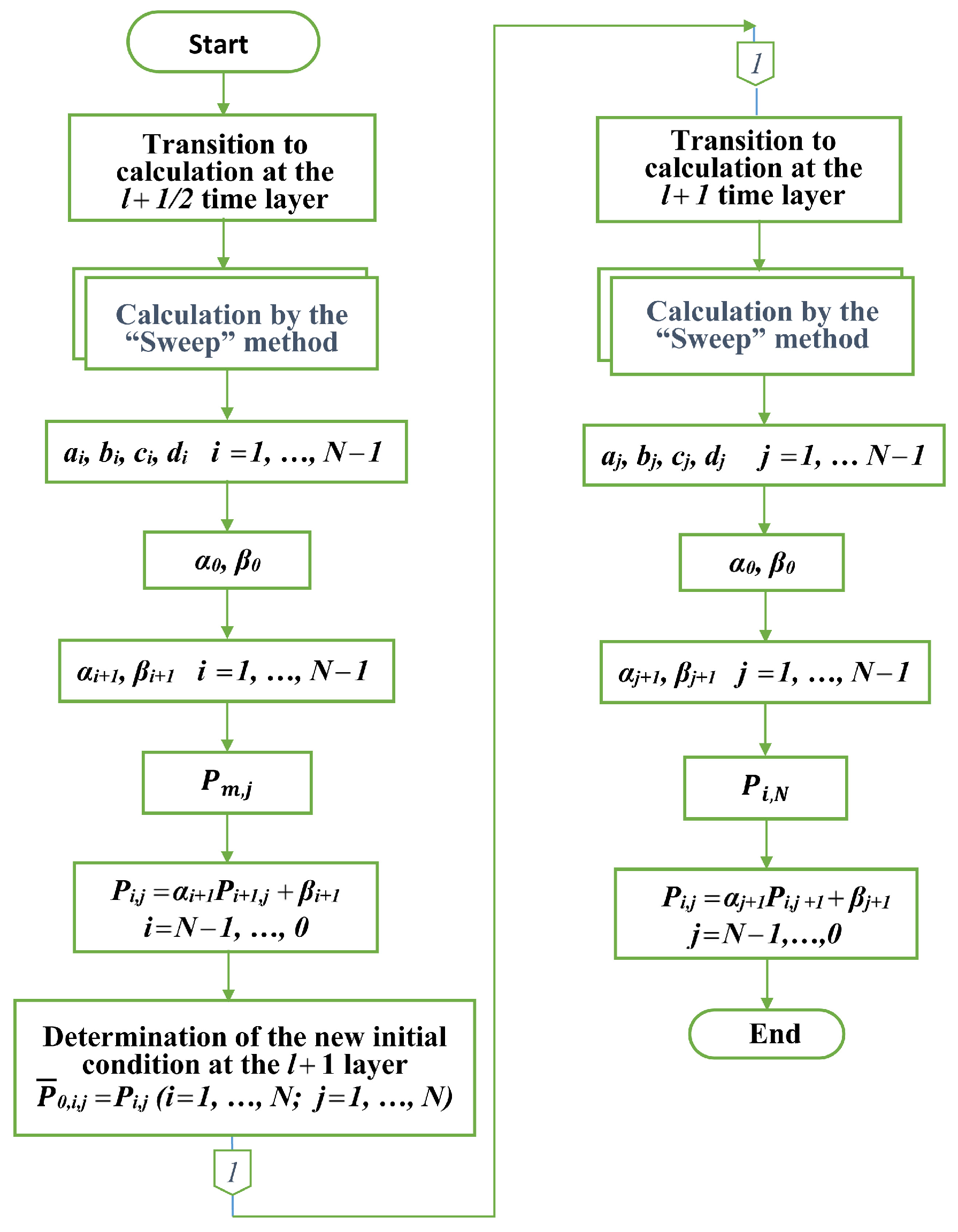 The numerical methodology developed in the previous section is implemented through a systematic computational algorithm that efficiently solves the two-dimensional gas filtration boundary value problem. The algorithm employs the Alternating Direction Implicit (ADI) scheme with quasi-linearization, decomposing the multi-dimensional problem into a sequence of one-dimensional tridiagonal systems that are solved using the Thomas algorithm (sweep method). This section presents a detailed description of the computational procedure, including the algorithmic structure and implementation workflow.